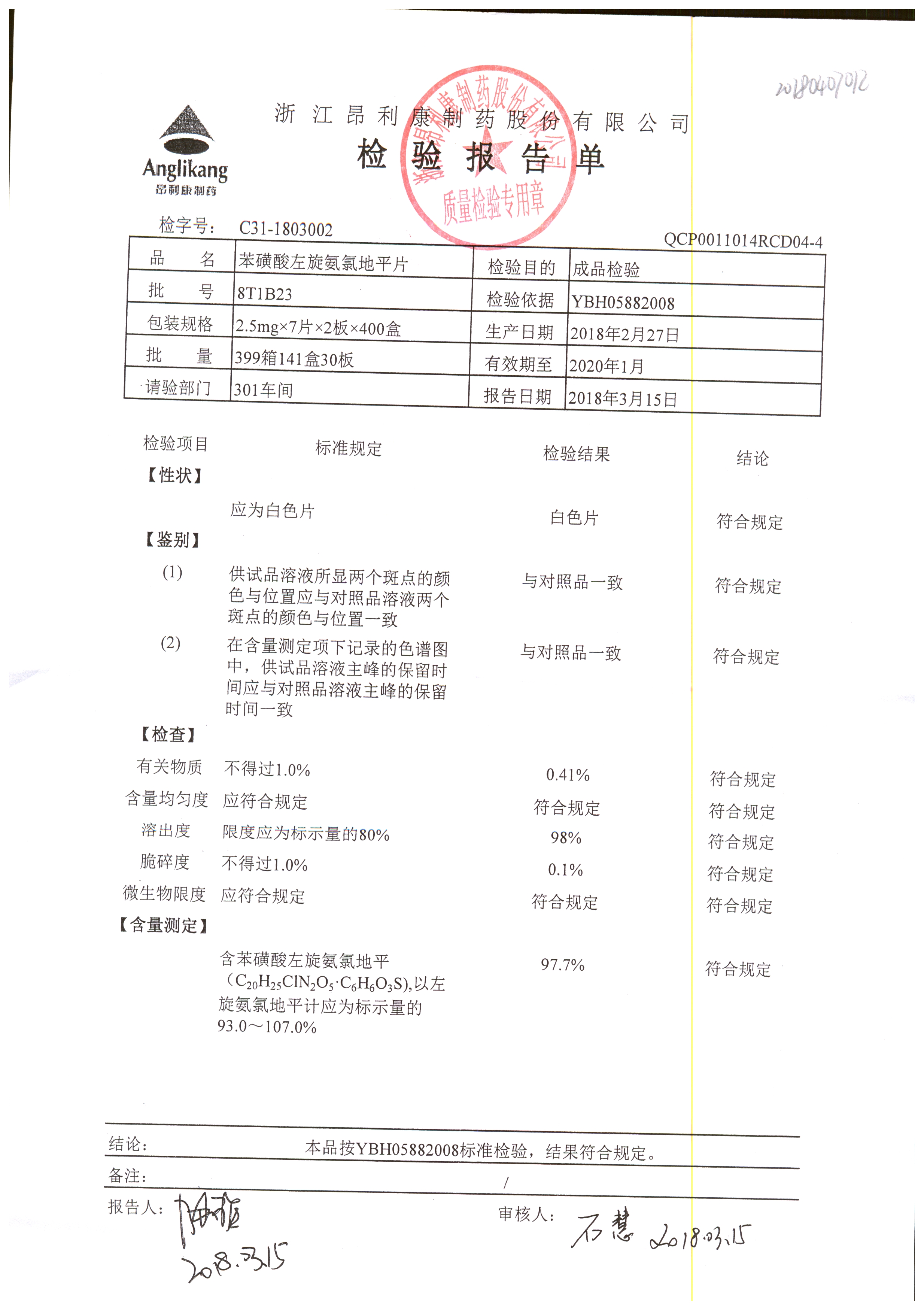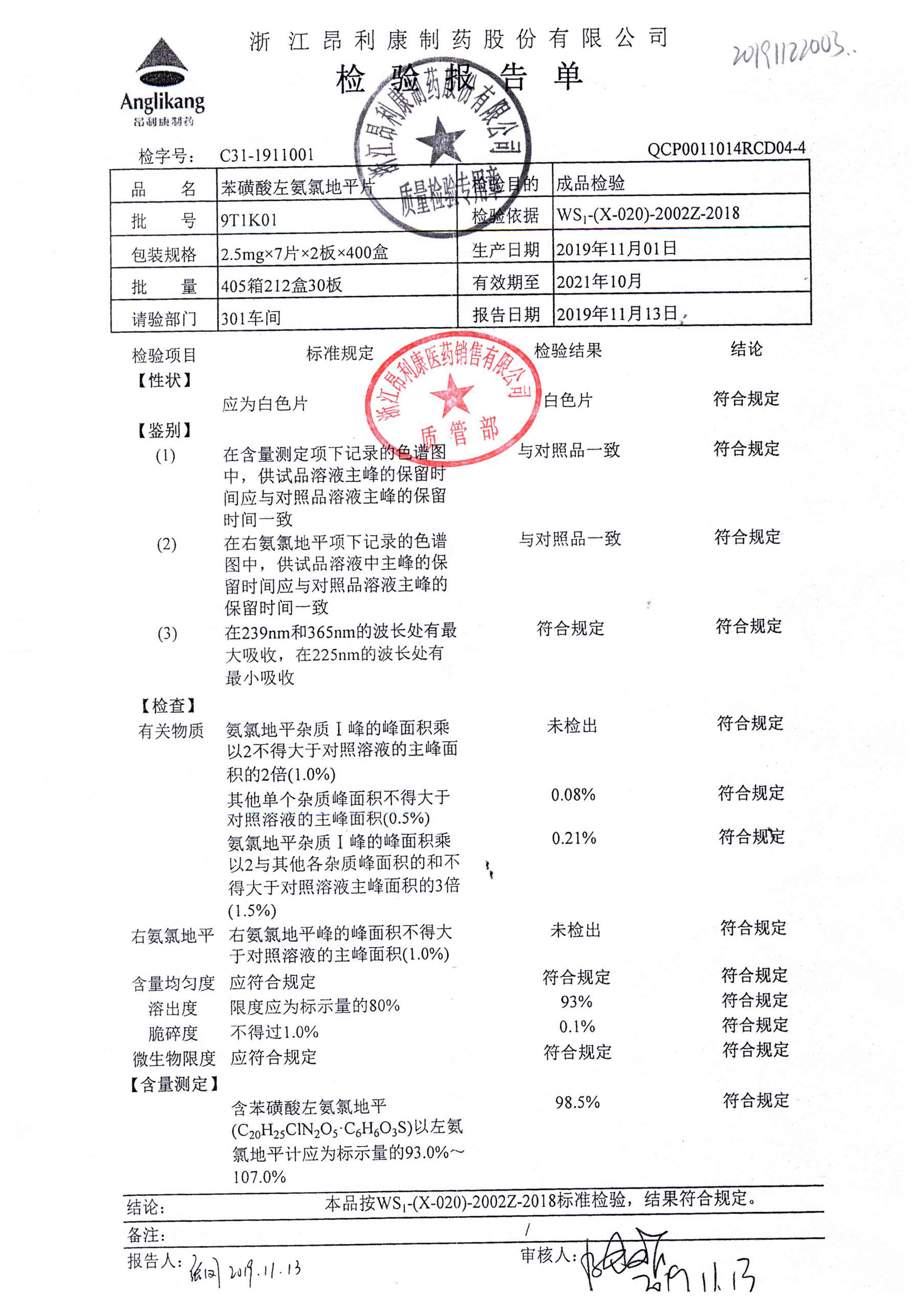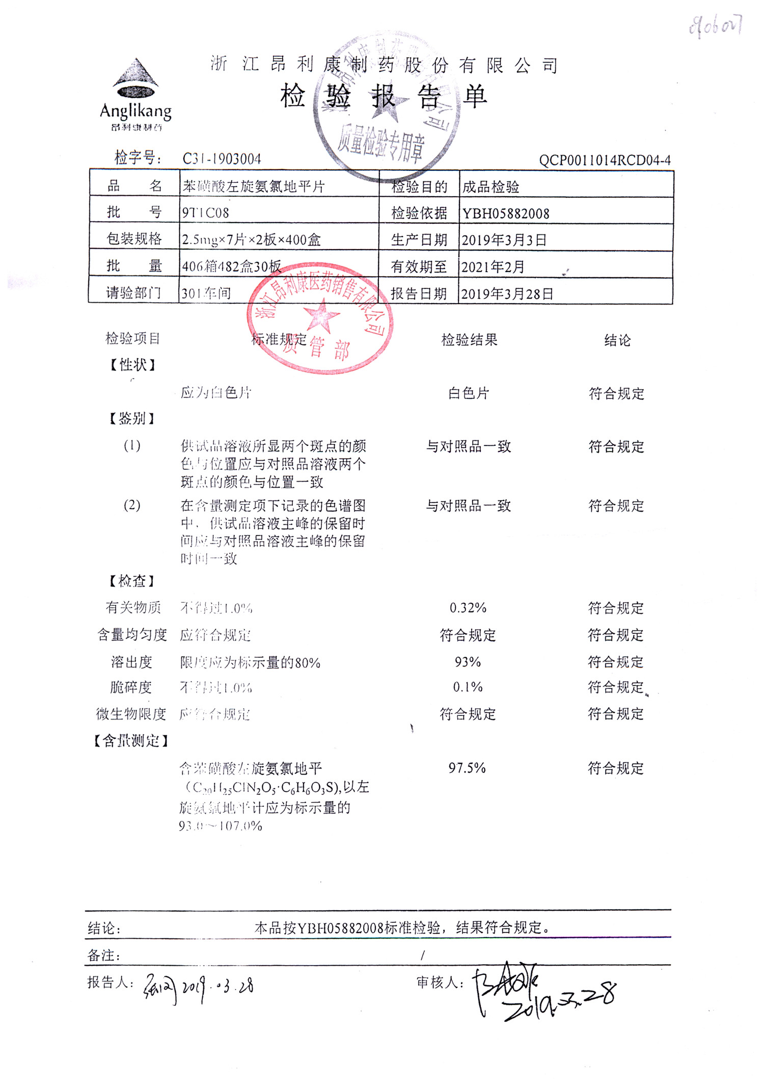 苯磺酸左旋氨氯地平片 | 2.5mg*14片 | 8T1L50 | 查看詳情 |