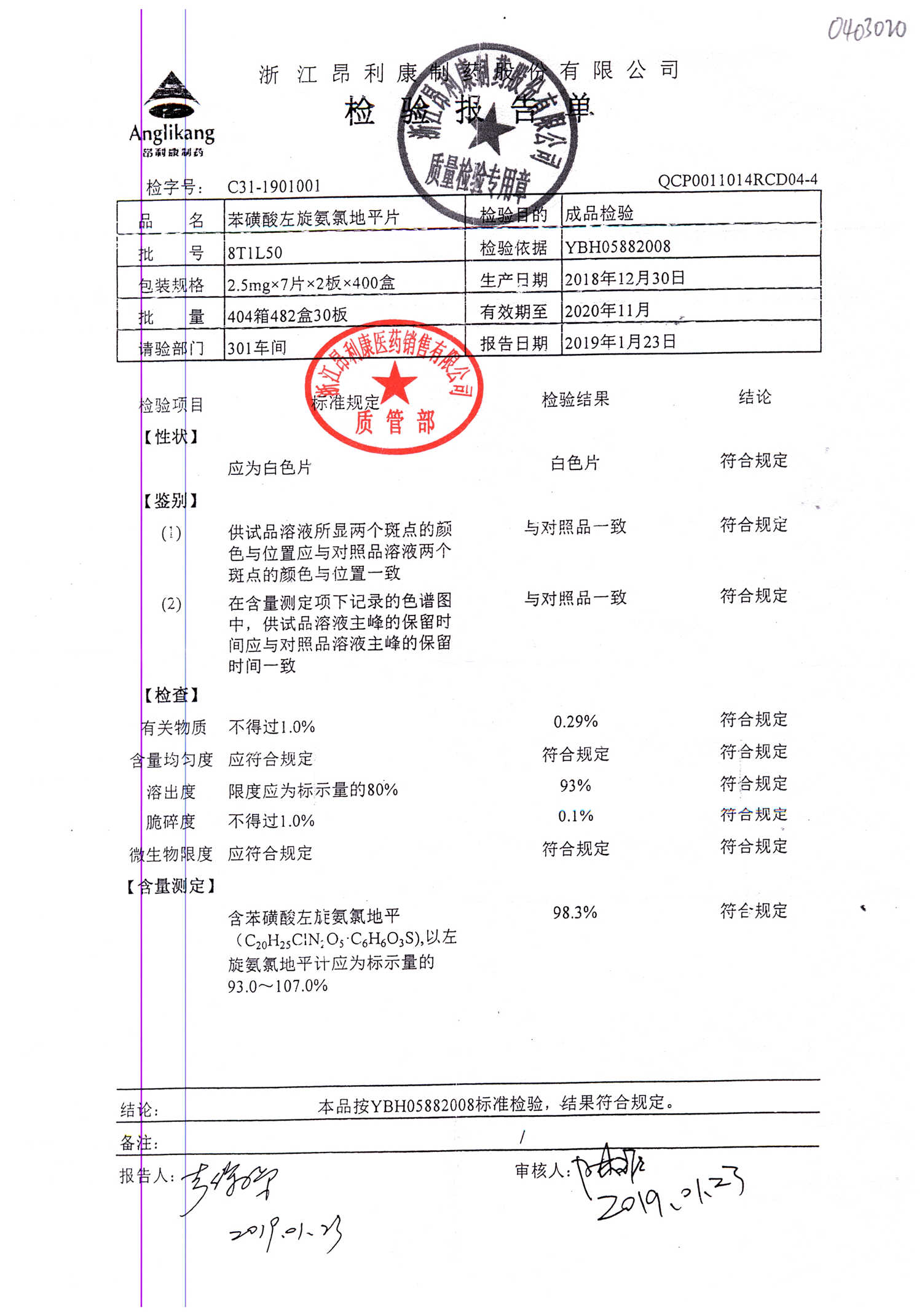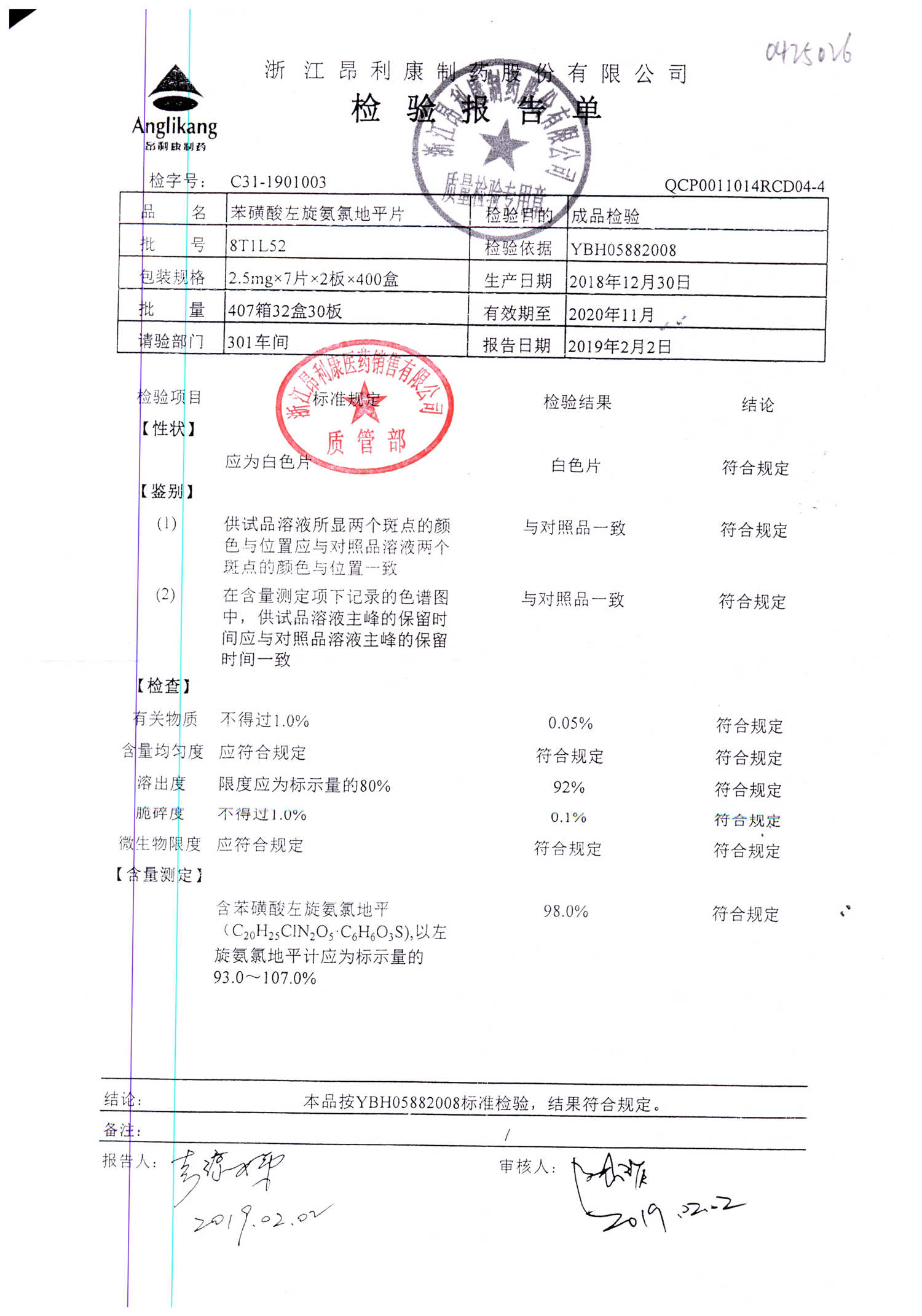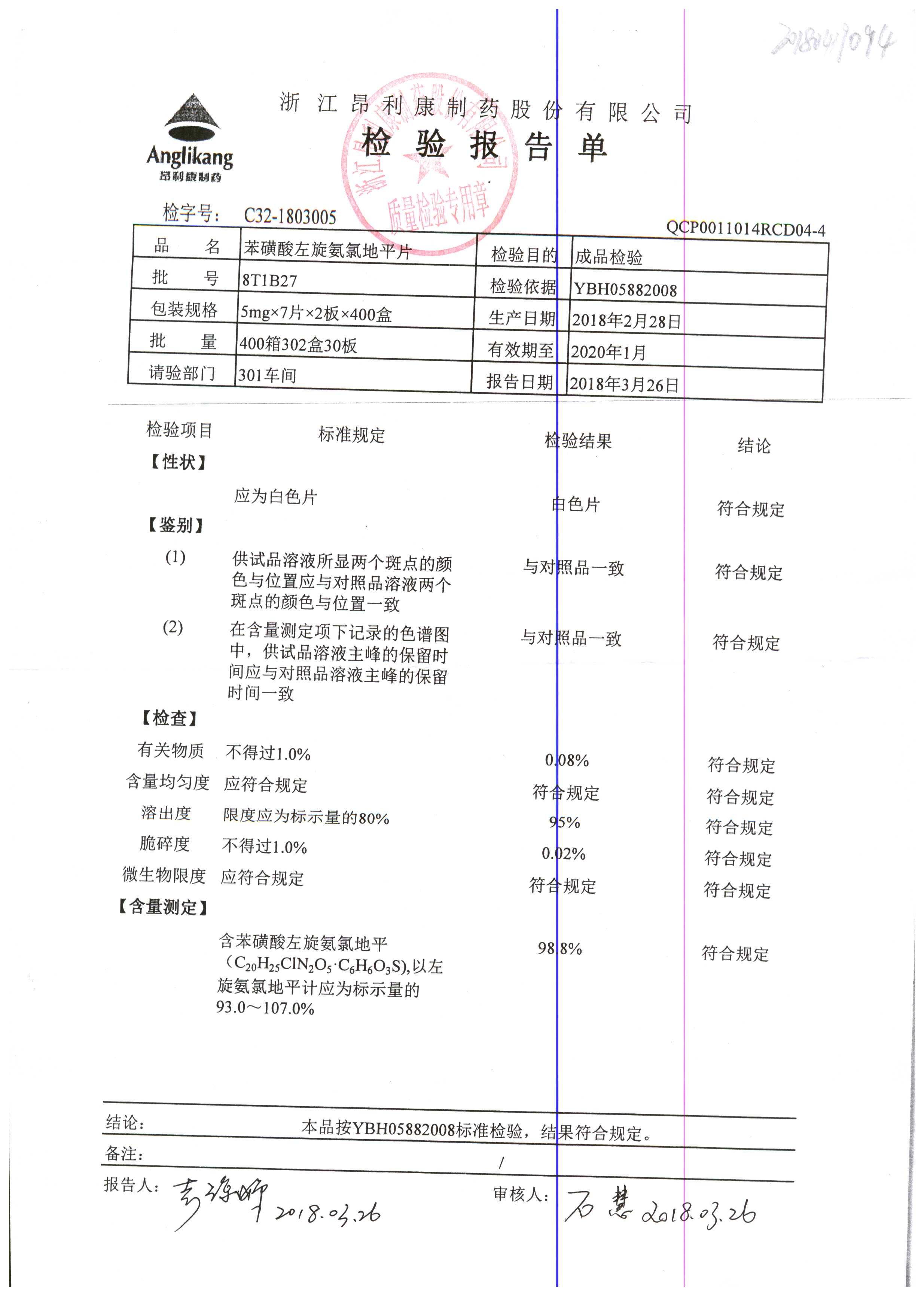 苯磺酸左旋氨氯地平片 | 2.5mg*14片 | 8T1L50 | 查看詳情 |