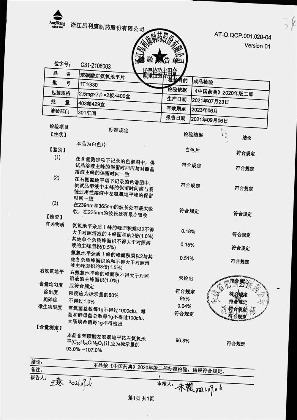 苯磺酸左旋氨氯地平片 | 2.5mg*14片 | 9T1K01 | 查看詳情 |