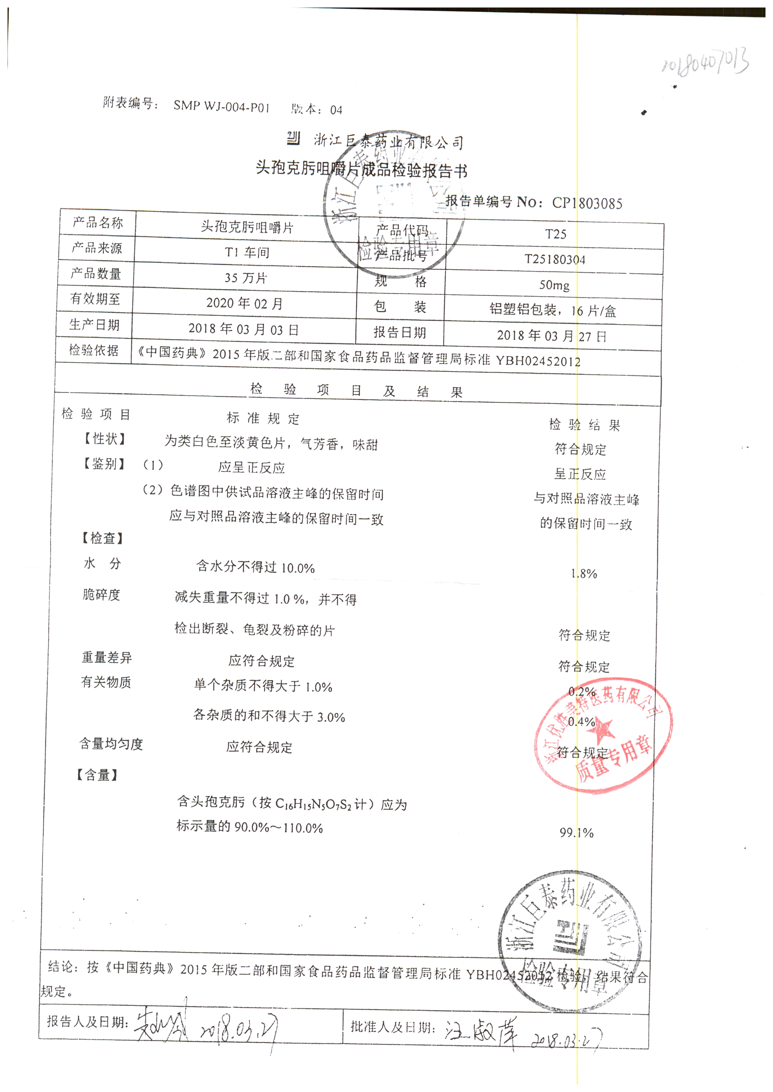 頭孢克肟咀嚼片 | 50mg*16s | T25190301 | 查看詳情 |