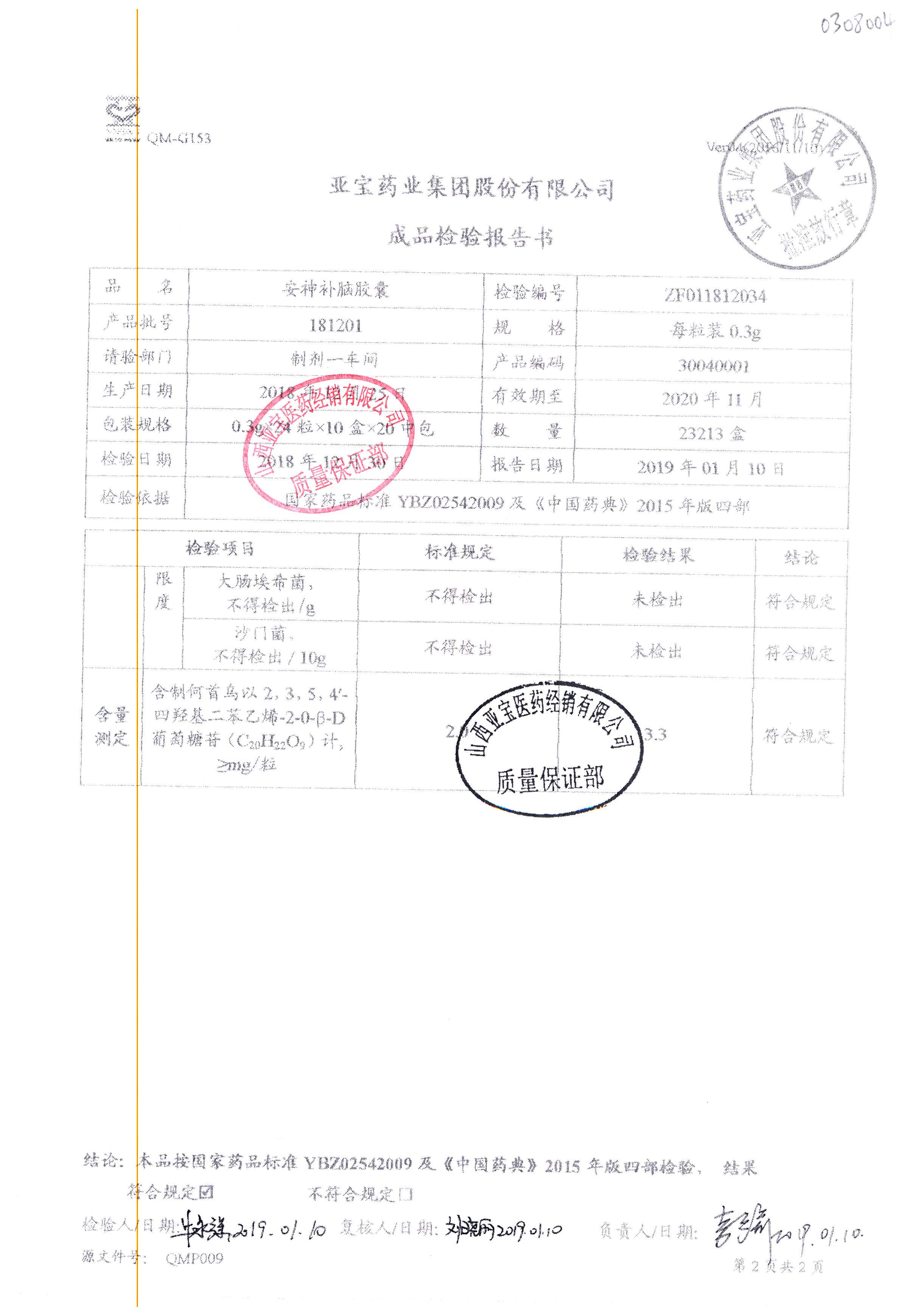 安神補腦膠囊 | 0.3g*24s | 181201(2/2) | 查看詳情 |