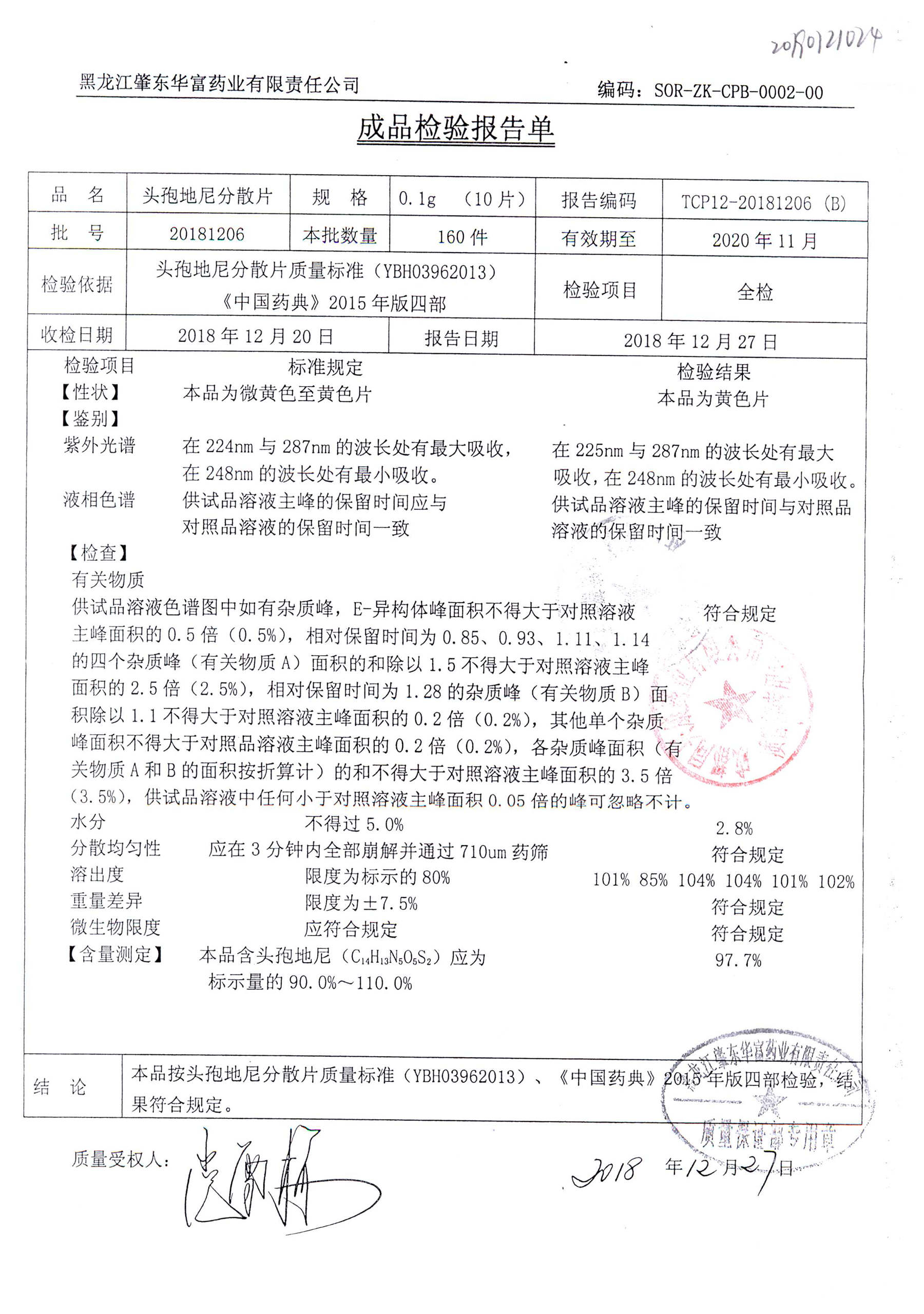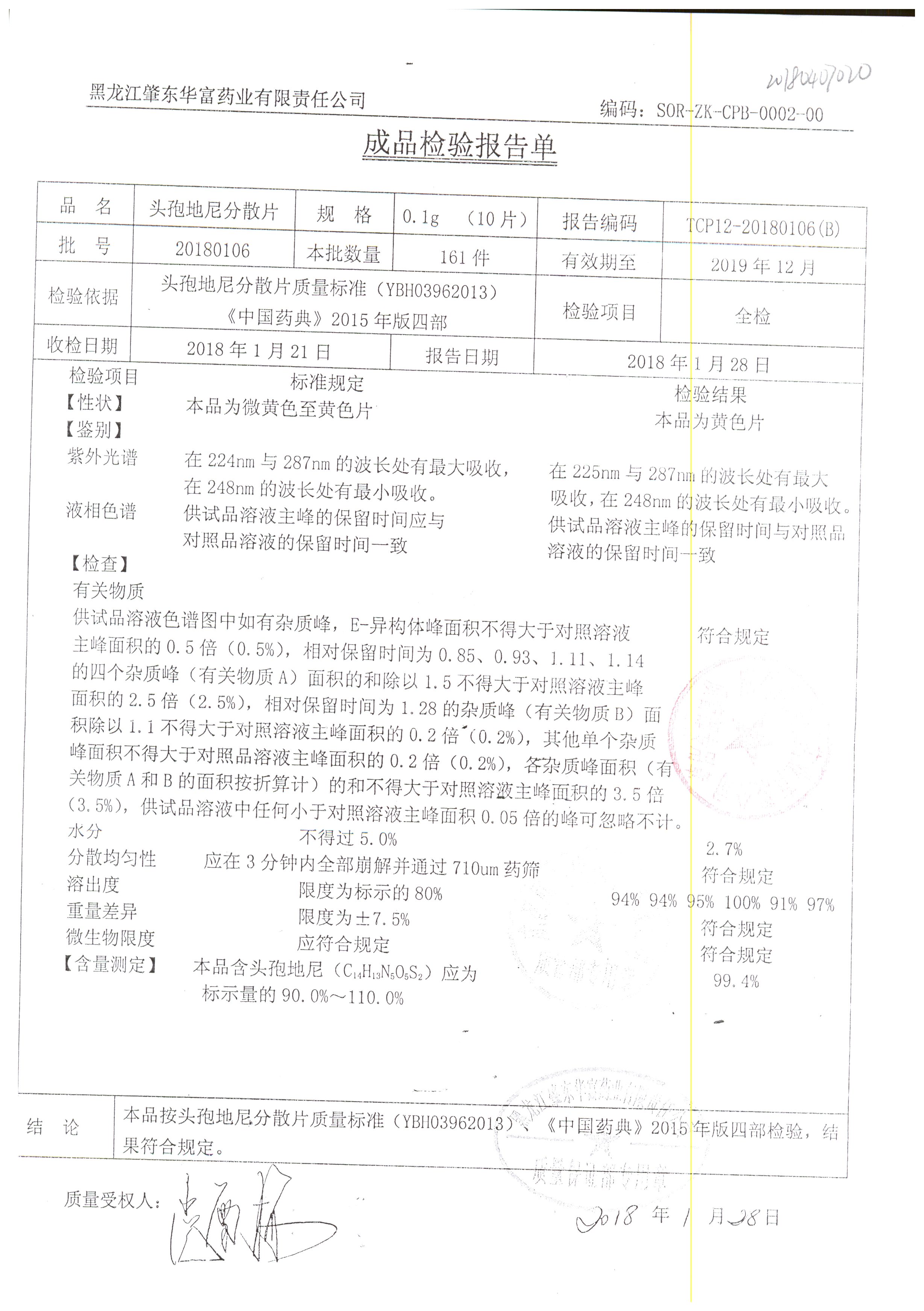 頭孢地尼分散片 | 0.1g*10s | 20190204 | 查看詳情 |