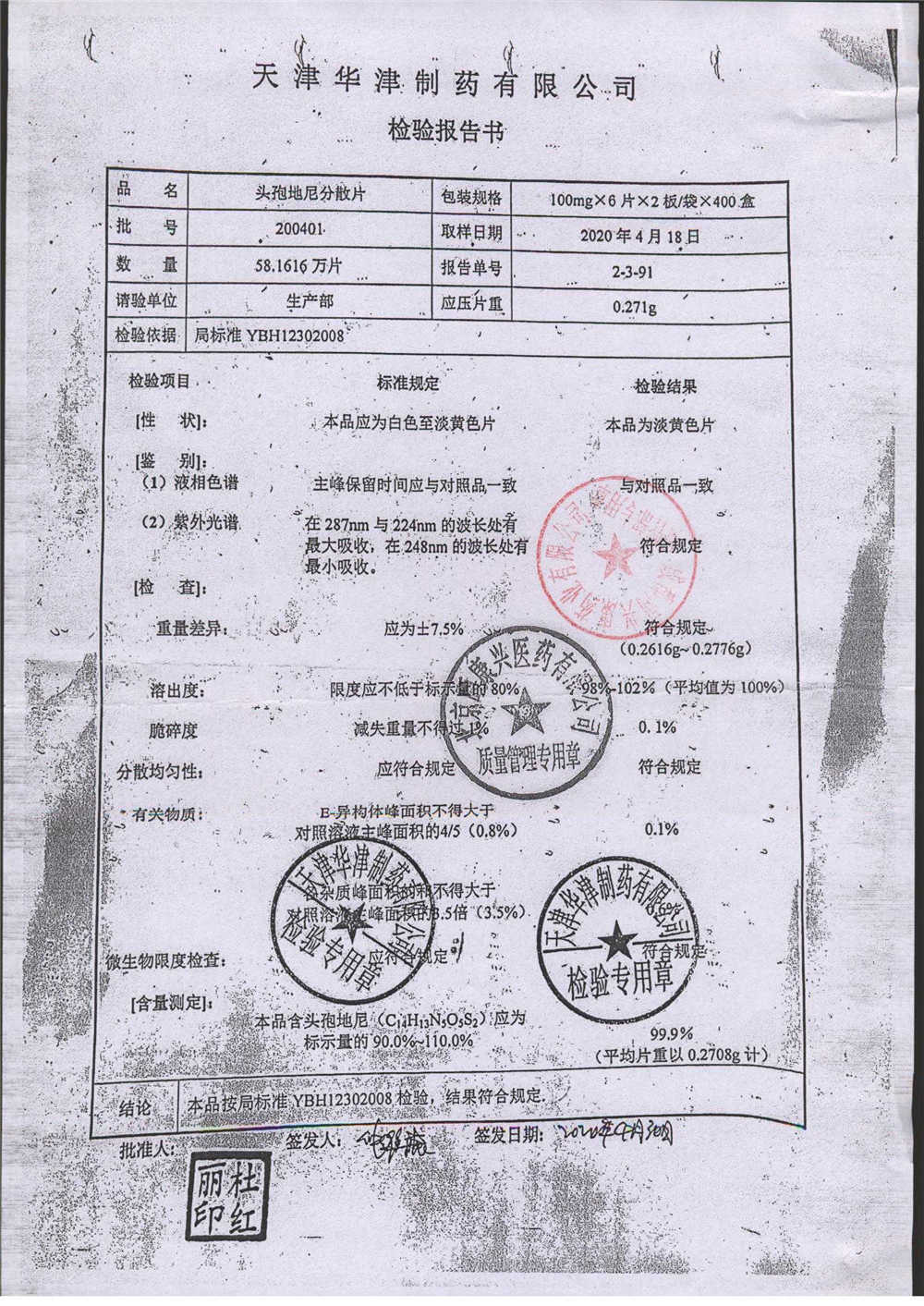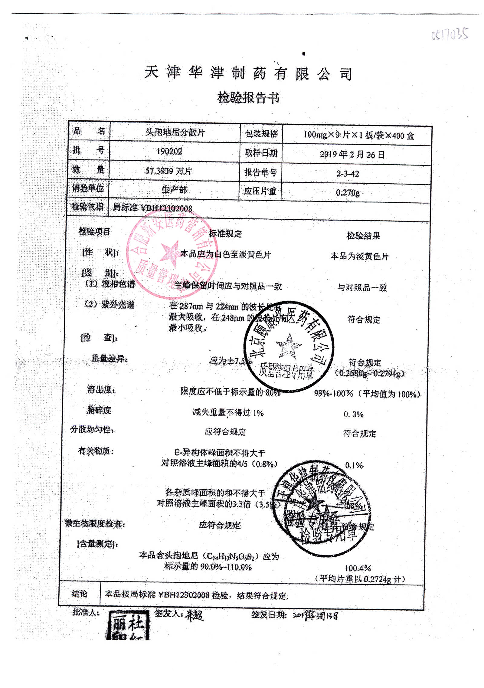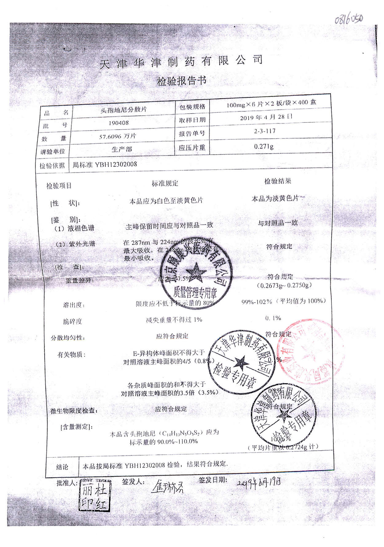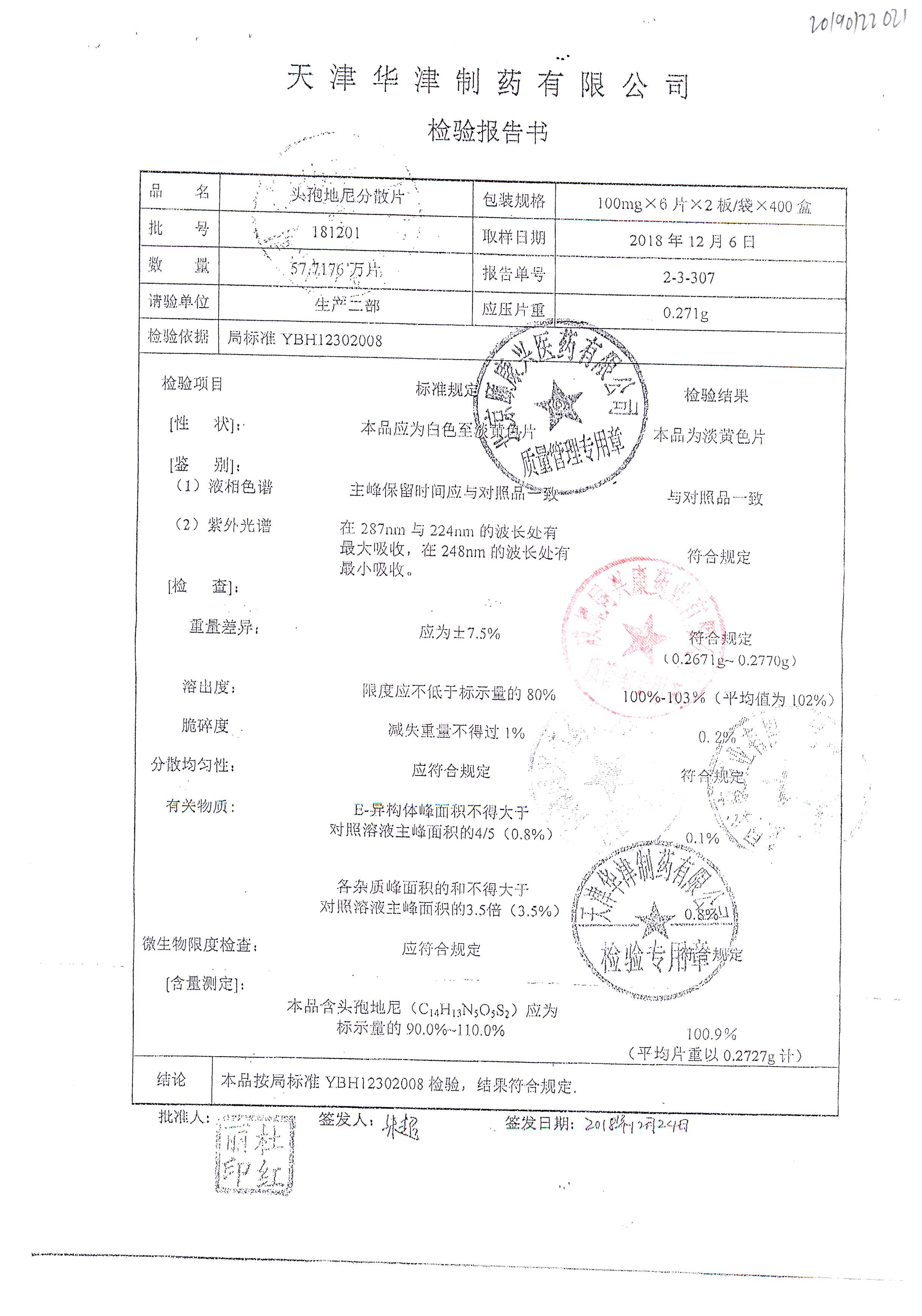頭孢地尼分散片 | 100mg*12片 | 190401 | 查看詳情 |