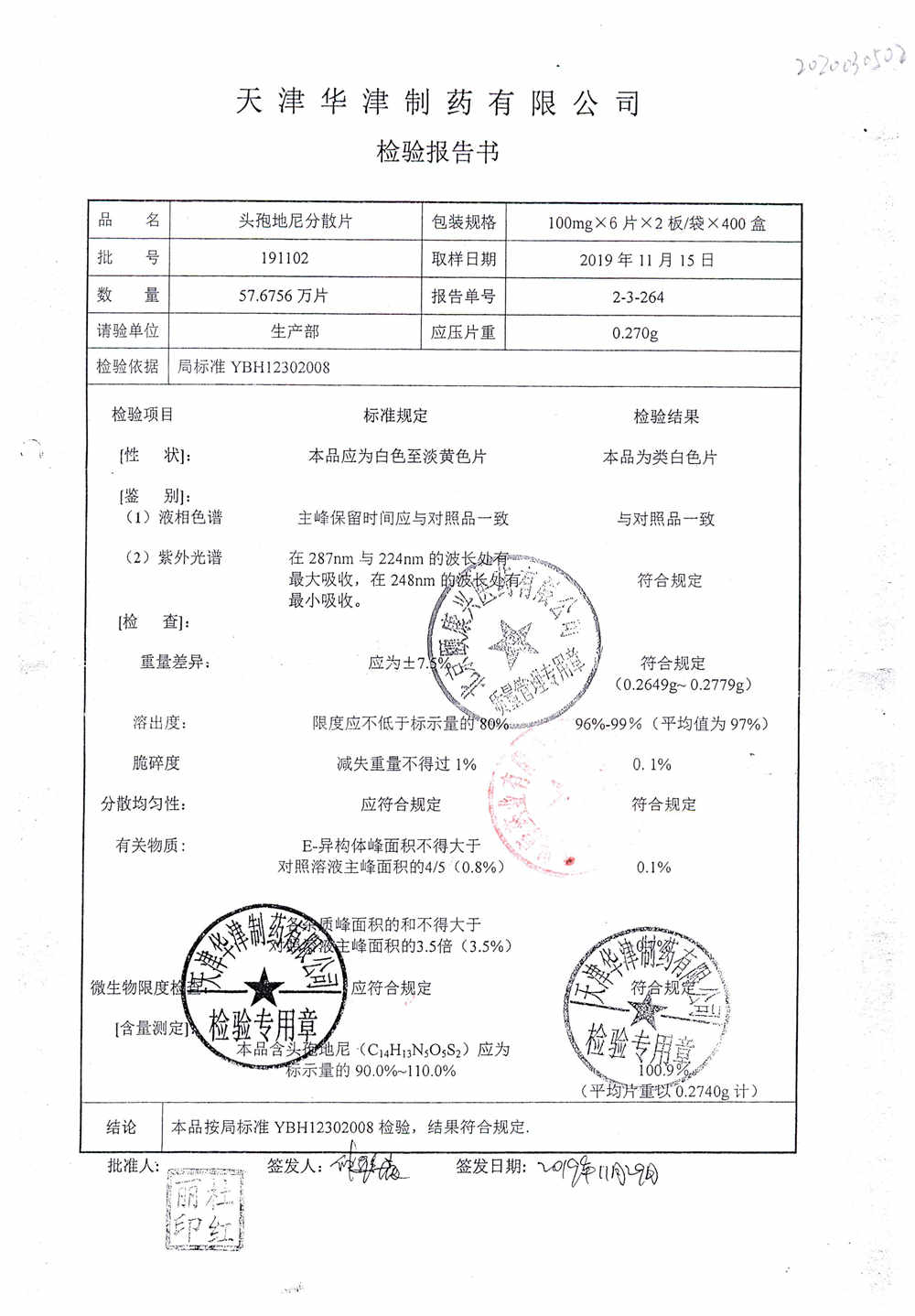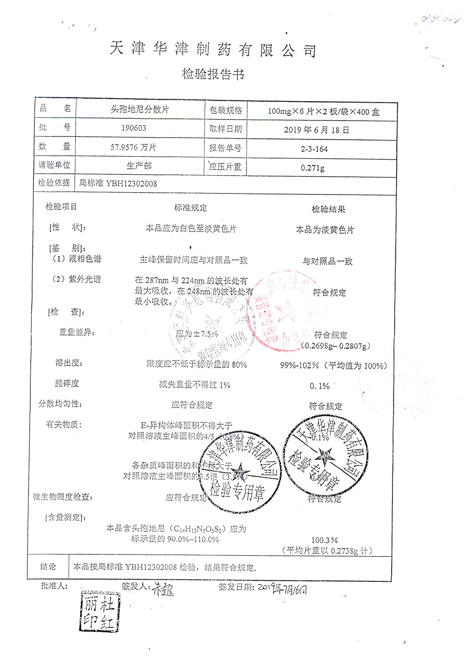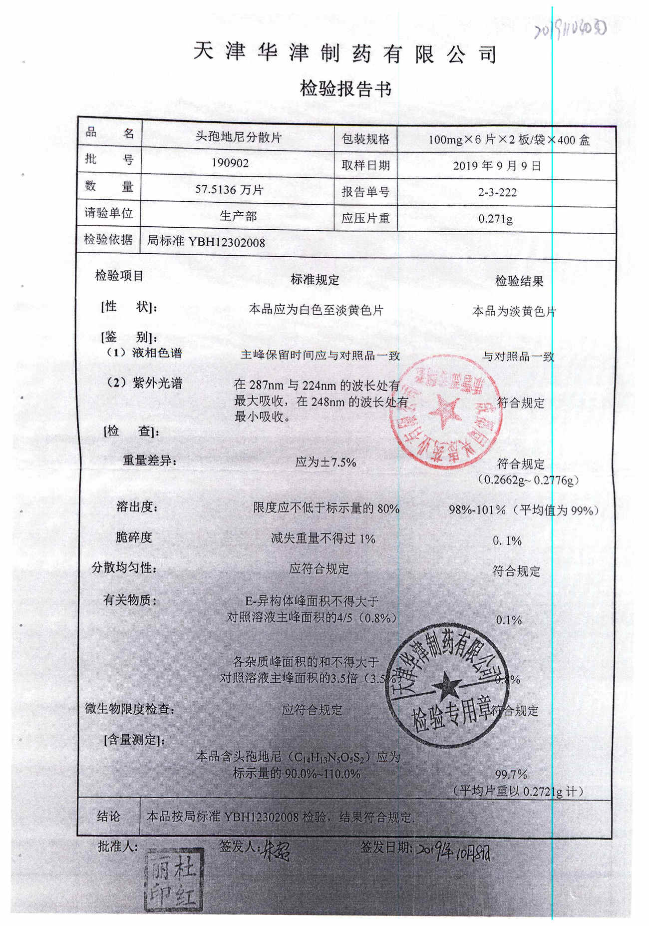 頭孢地尼分散片 | 100mg*12片 | 190603 | 查看詳情 |