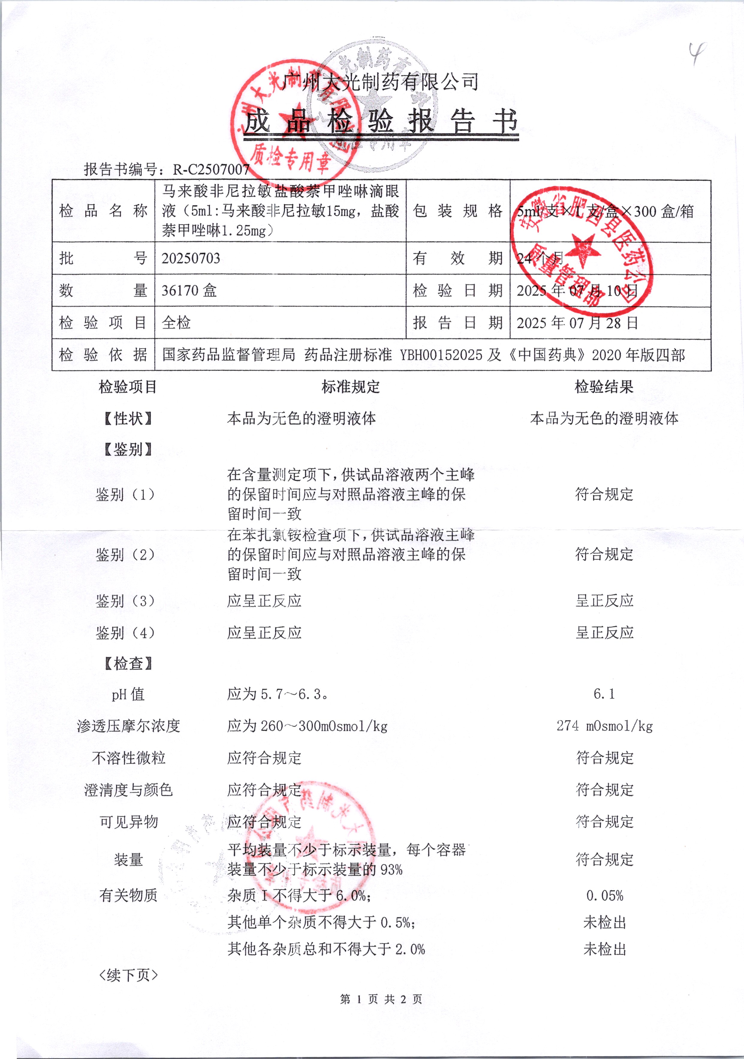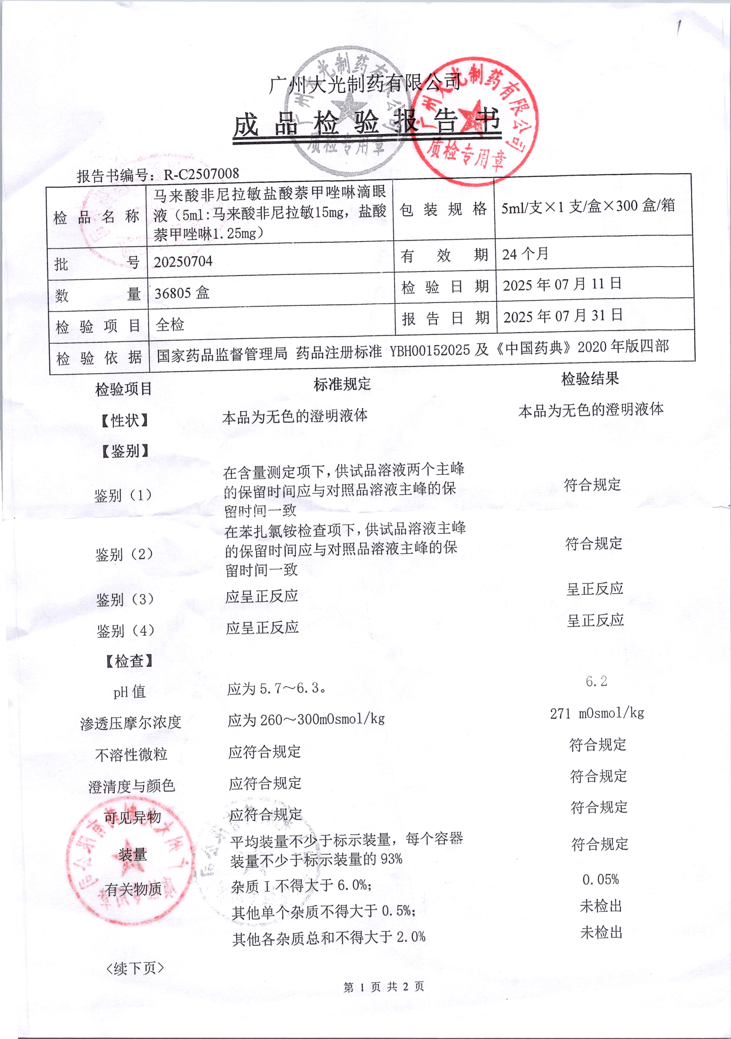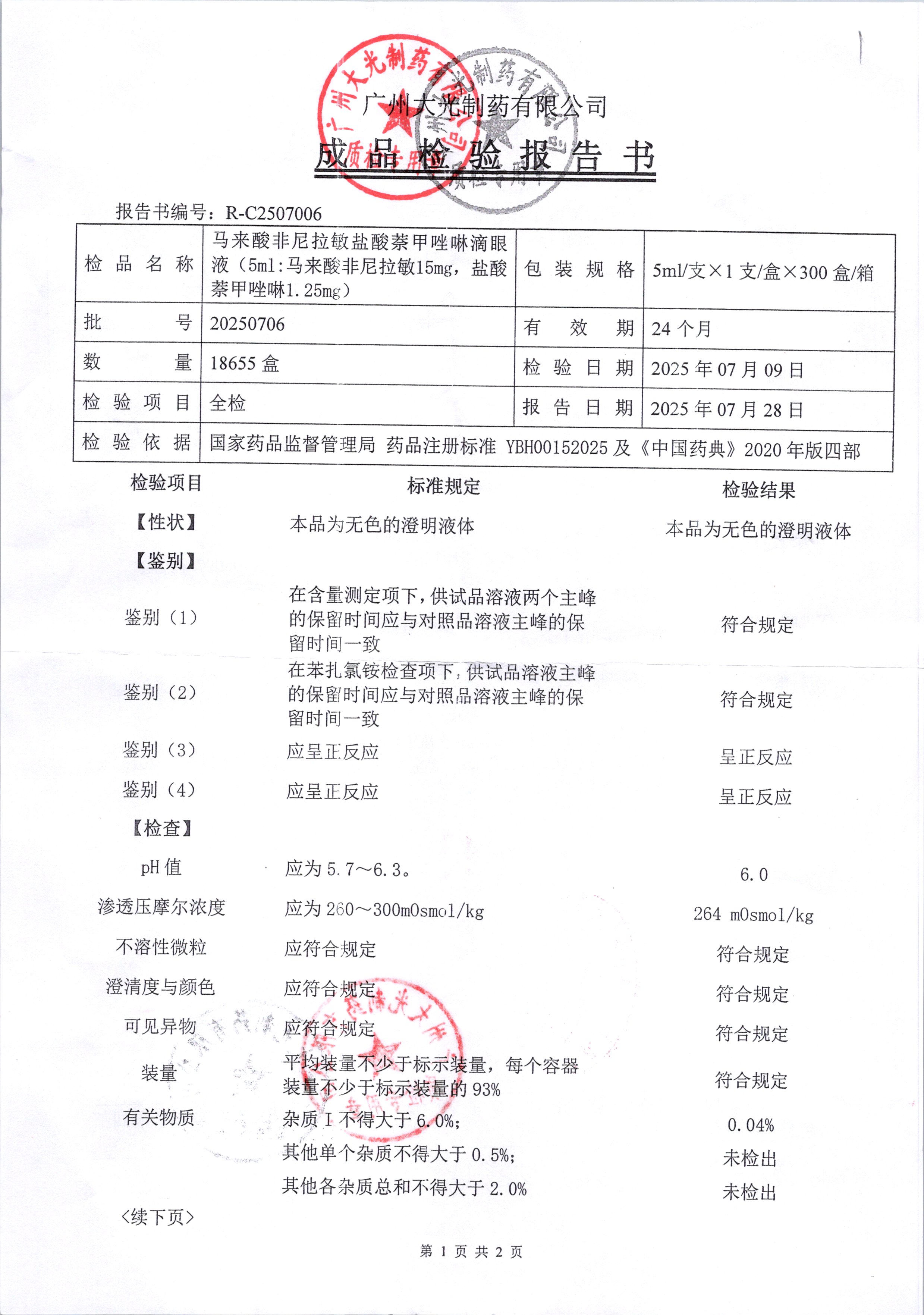 馬來酸非尼拉敏鹽酸萘甲唑啉滴眼液 | 5ml | 20250704/1 | 查看詳情 |