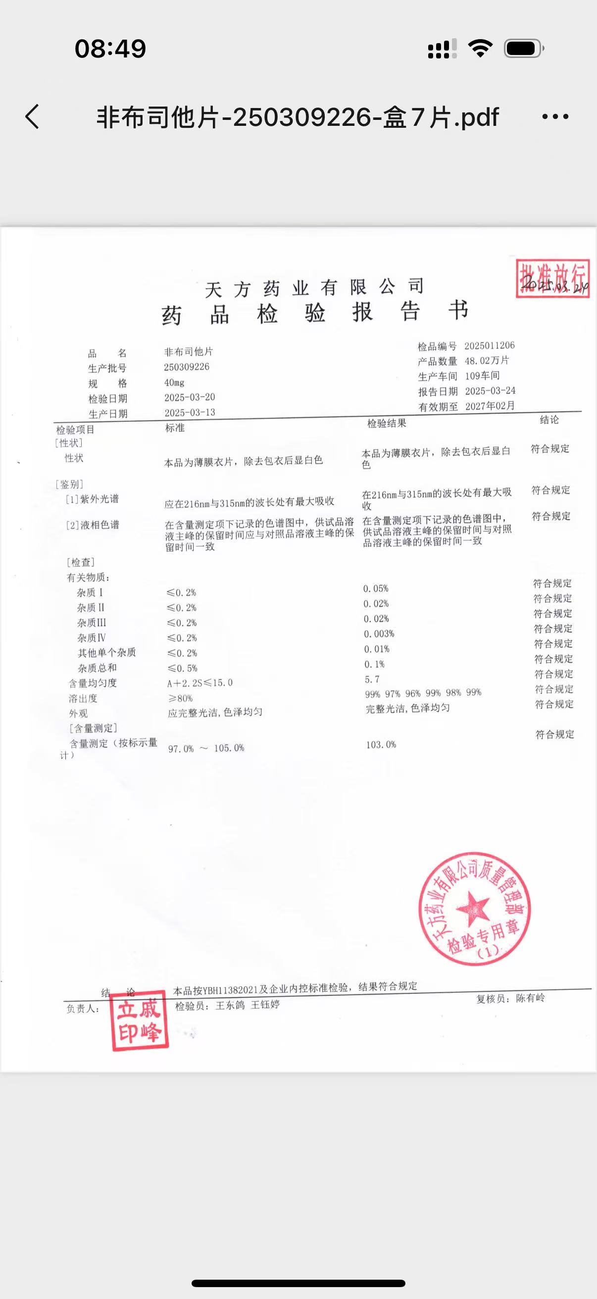 非布司他片 | 40mg | 250309226 | 查看詳情 |