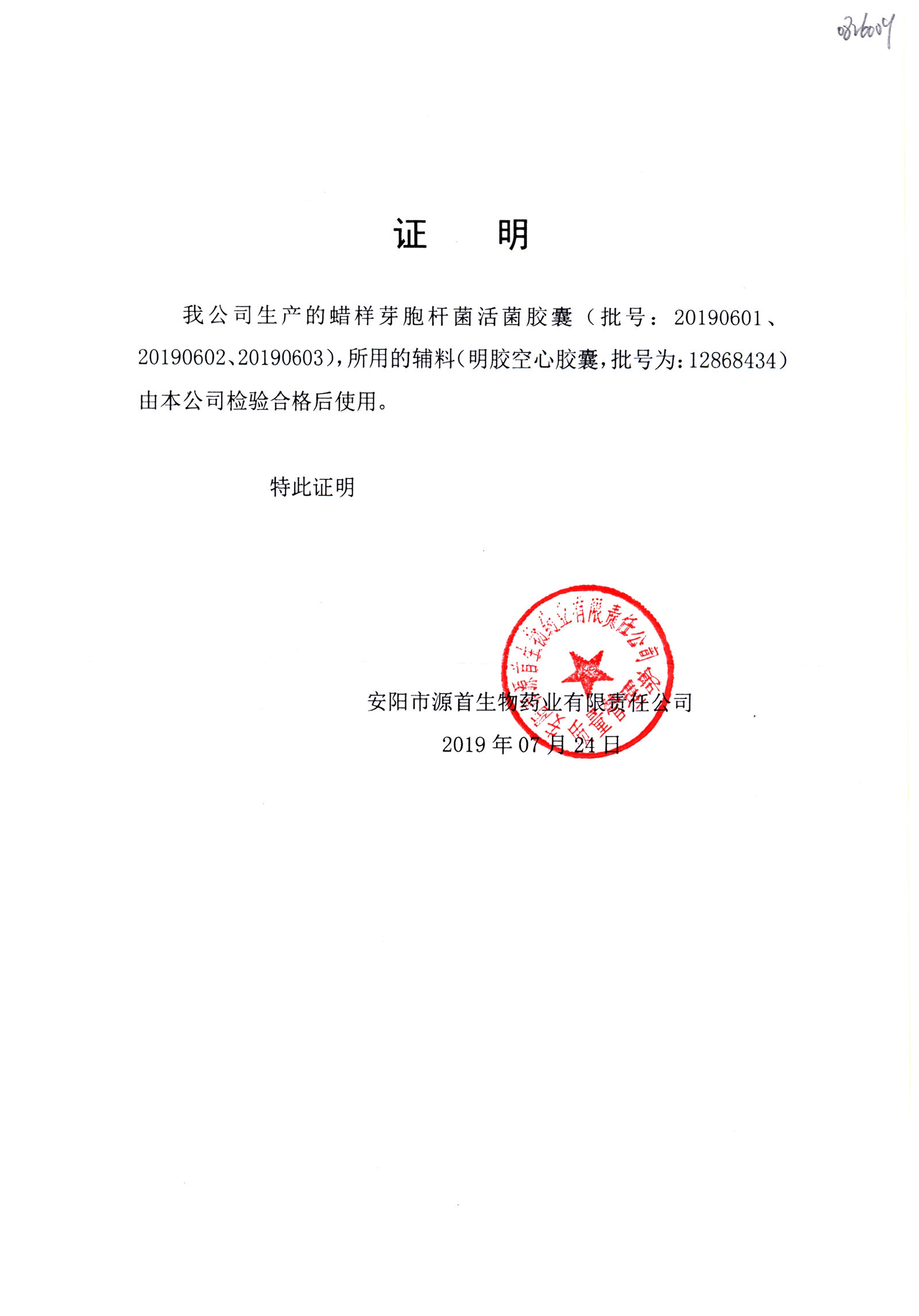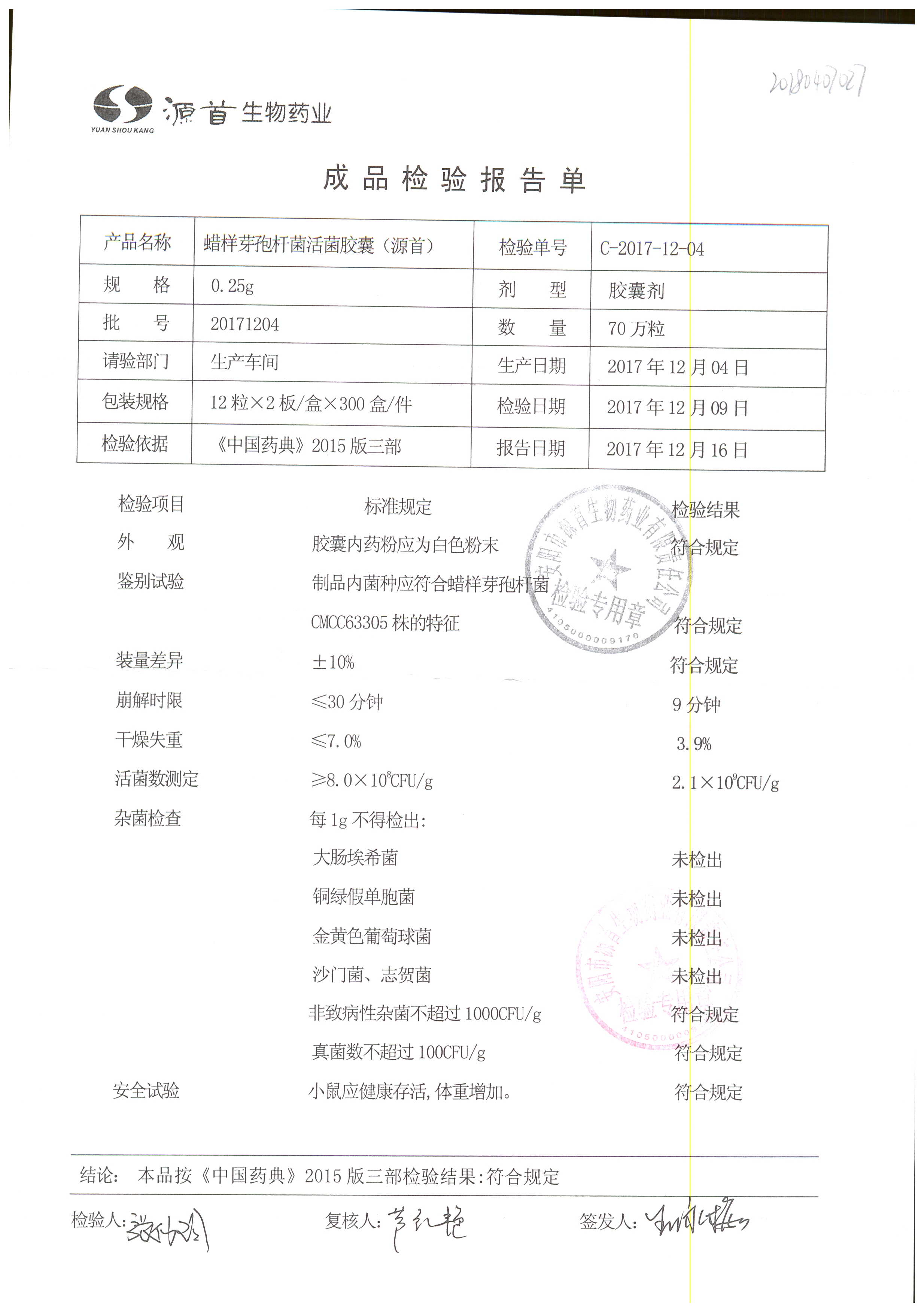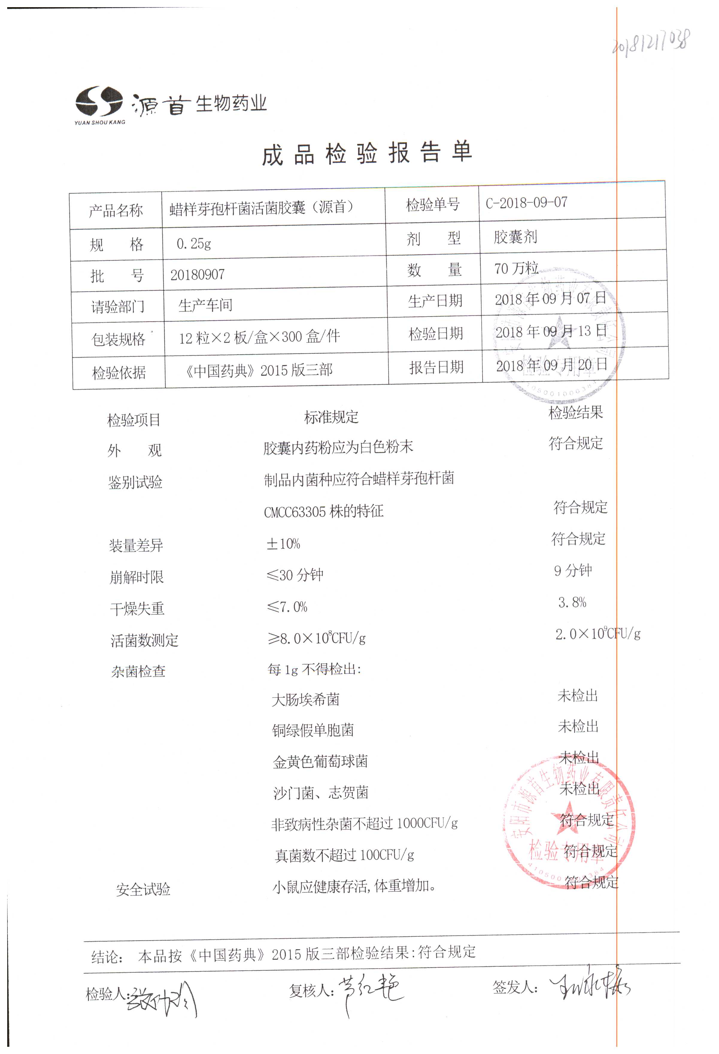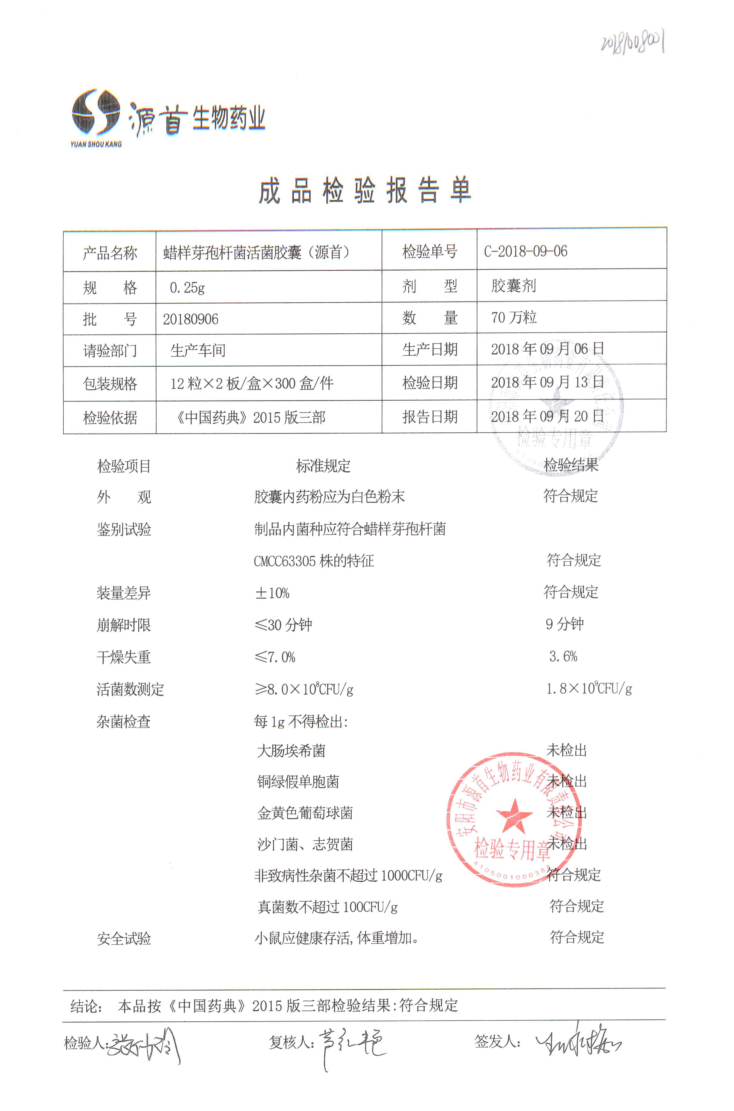 蠟樣芽孢桿菌活菌膠囊(源首) | 0.25g | 20180907(2/3) | 查看詳情 |