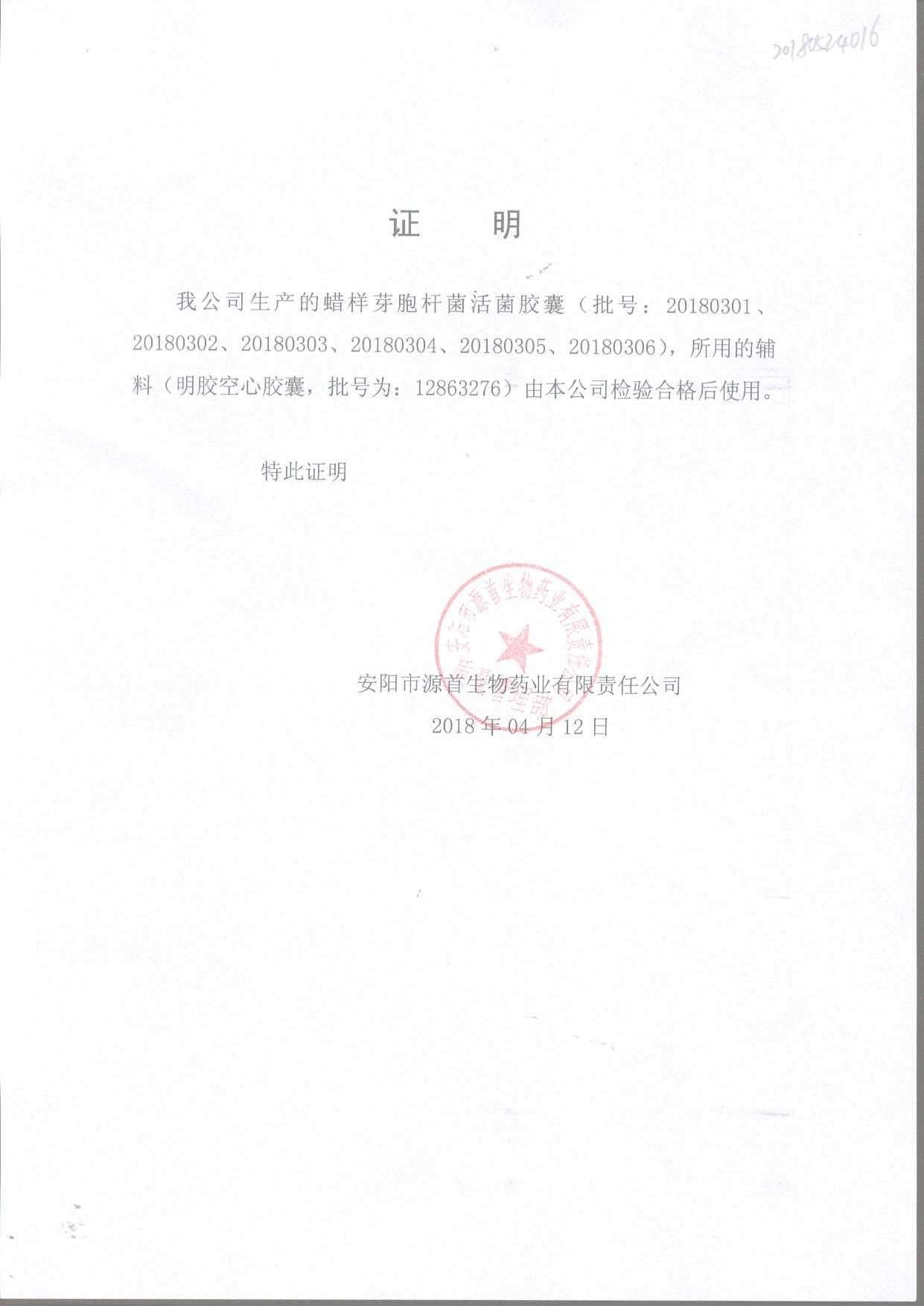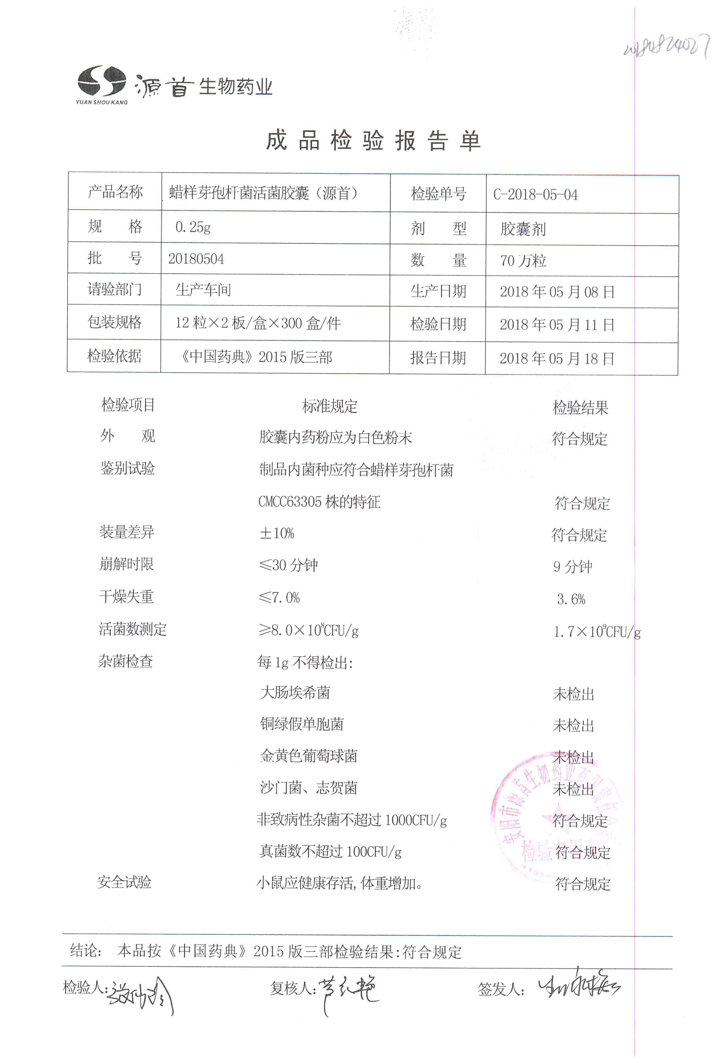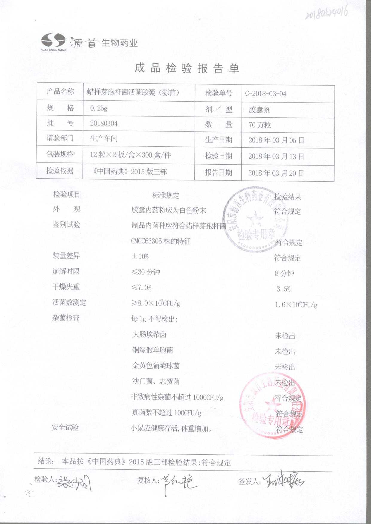 蠟樣芽孢桿菌活菌膠囊(源首) | 0.25g | 20180504(2/3) | 查看詳情 |