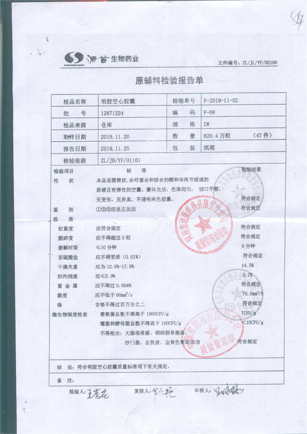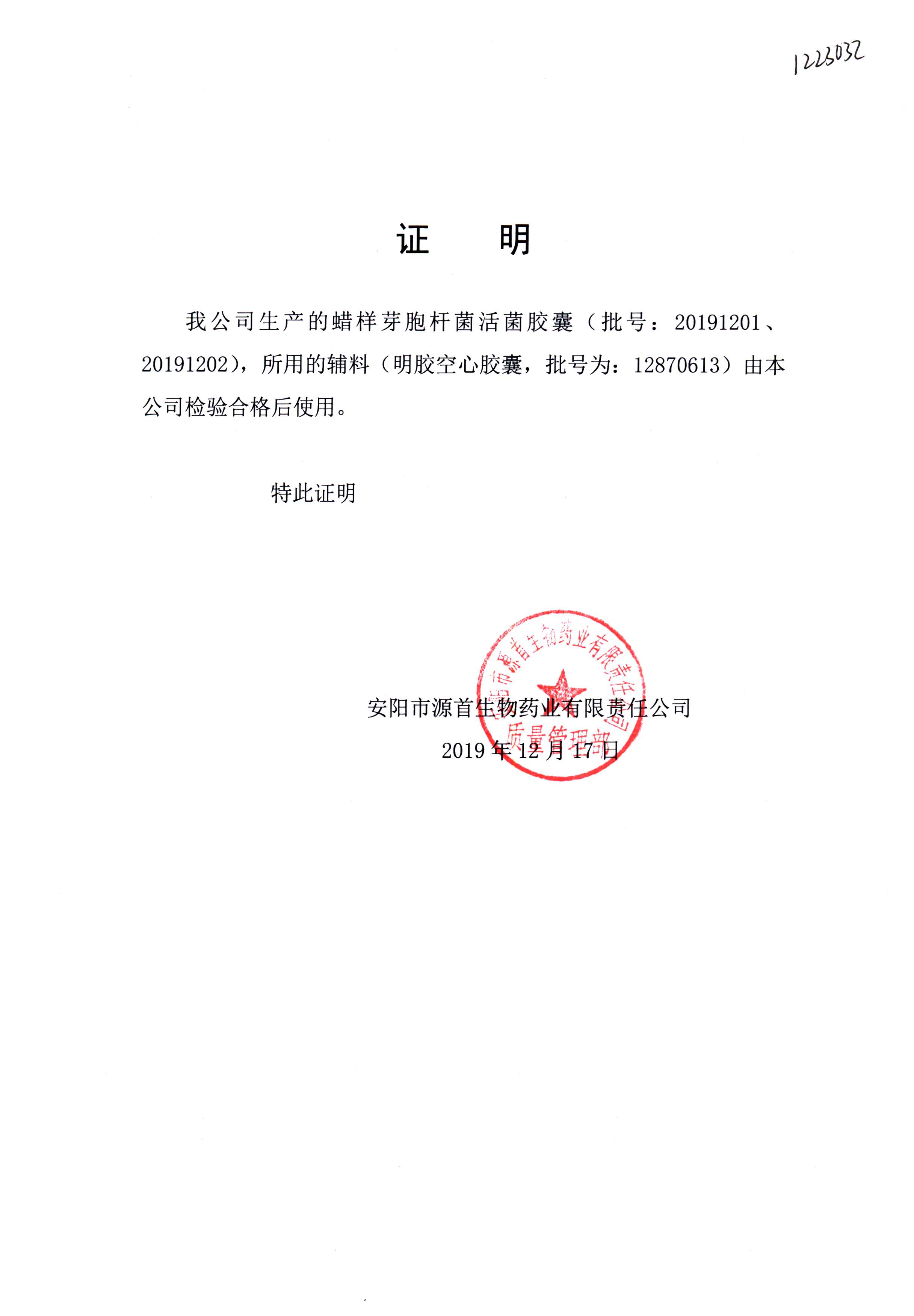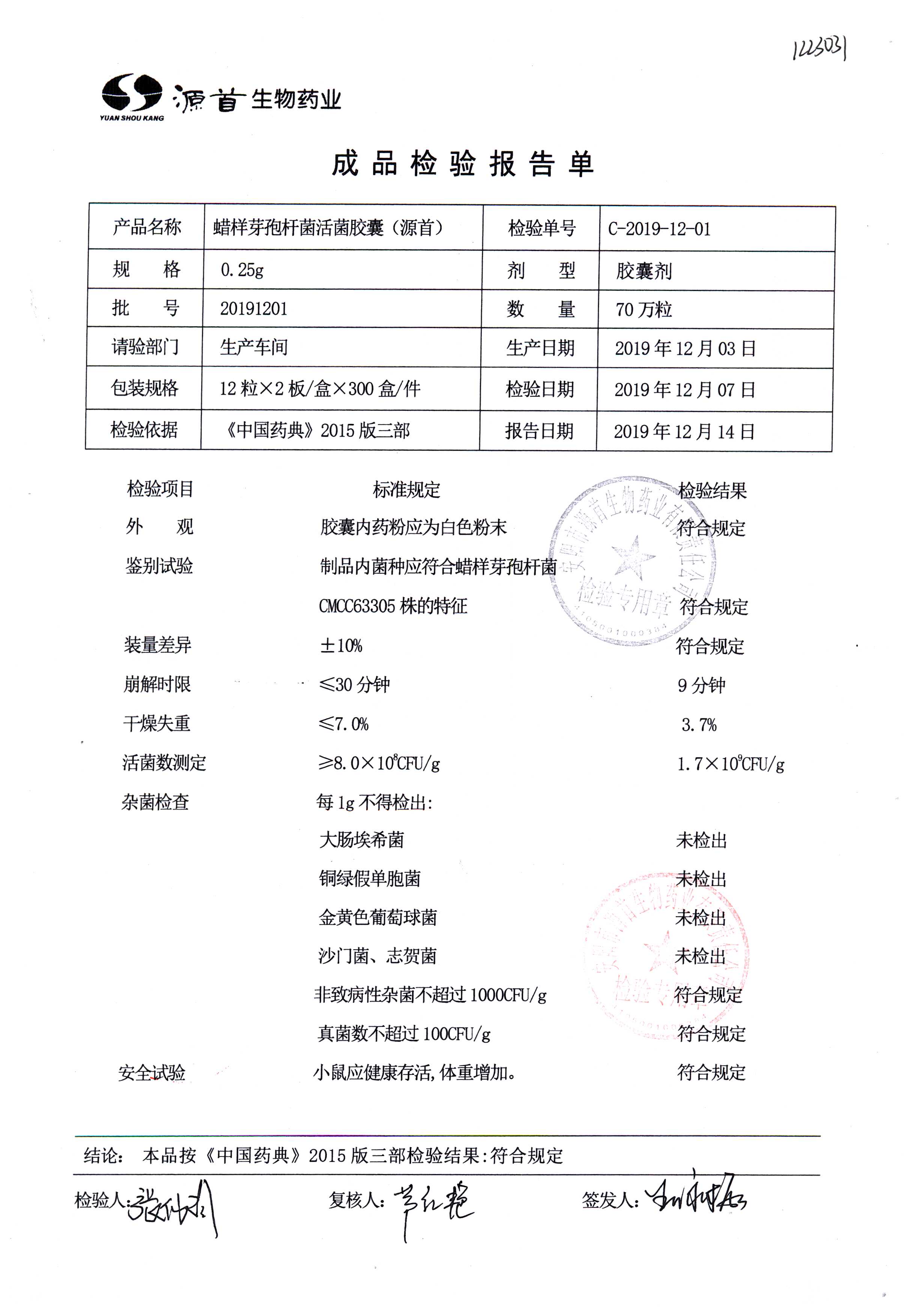蠟樣芽孢桿菌活菌膠囊(源首) | 0.25g | 20191201(2/3) | 查看詳情 |