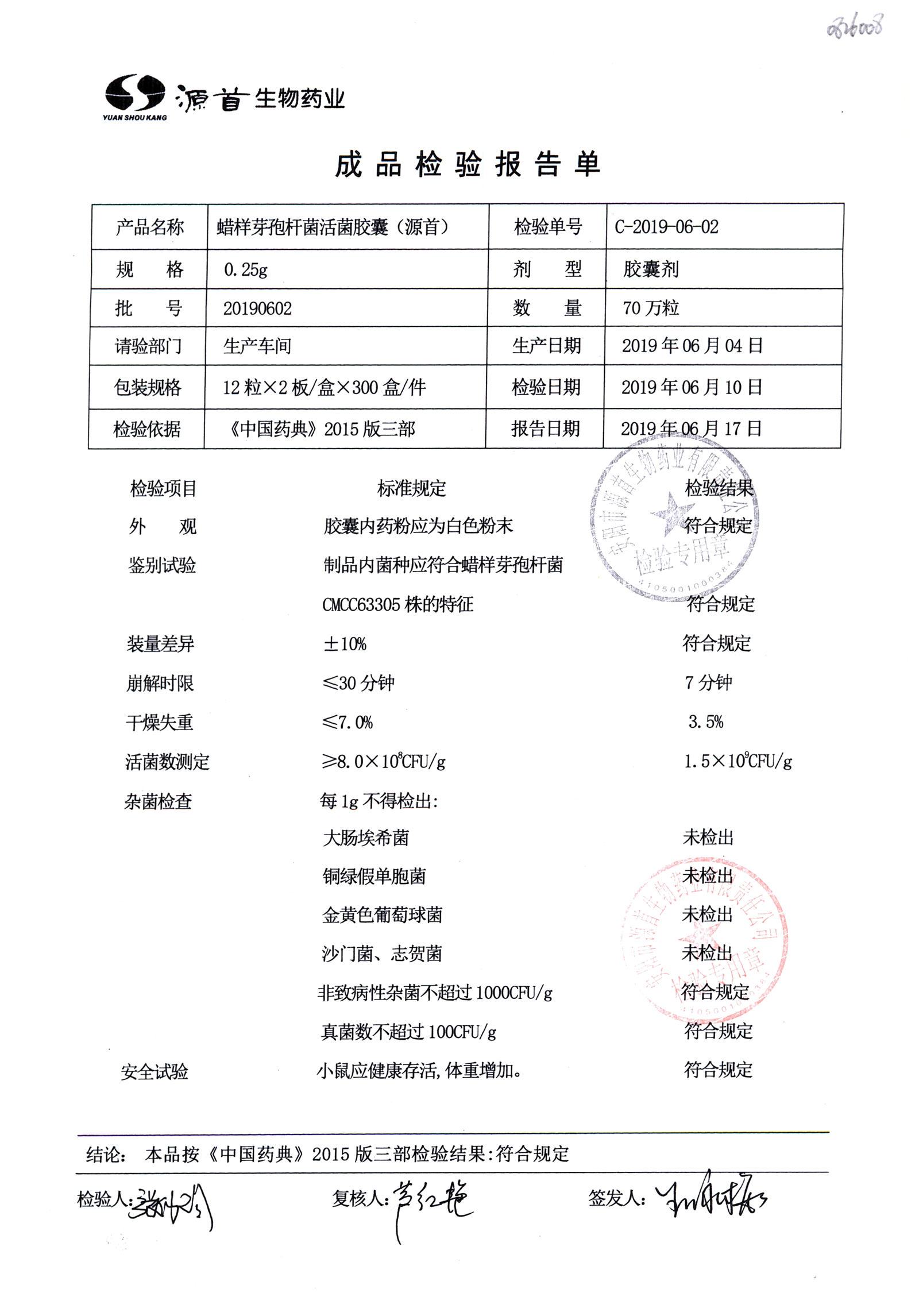 蠟樣芽孢桿菌活菌膠囊(源首) | 0.25g | 20190602(3/3) | 查看詳情 |