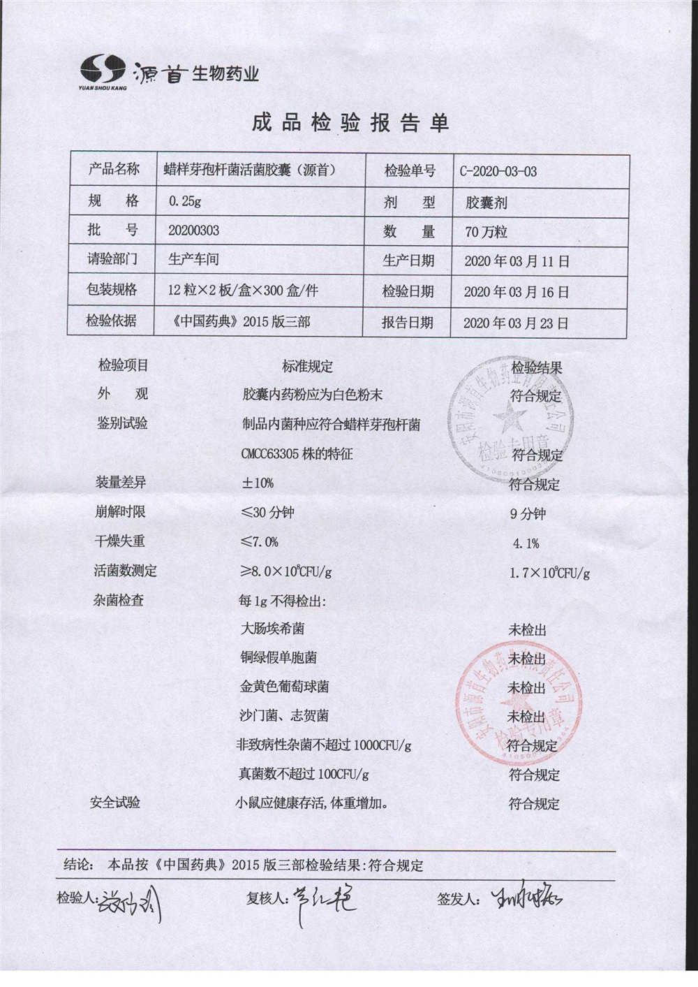 蠟樣芽孢桿菌活菌膠囊(源首) | 0.25g | 20200303(3/3) | 查看詳情 |