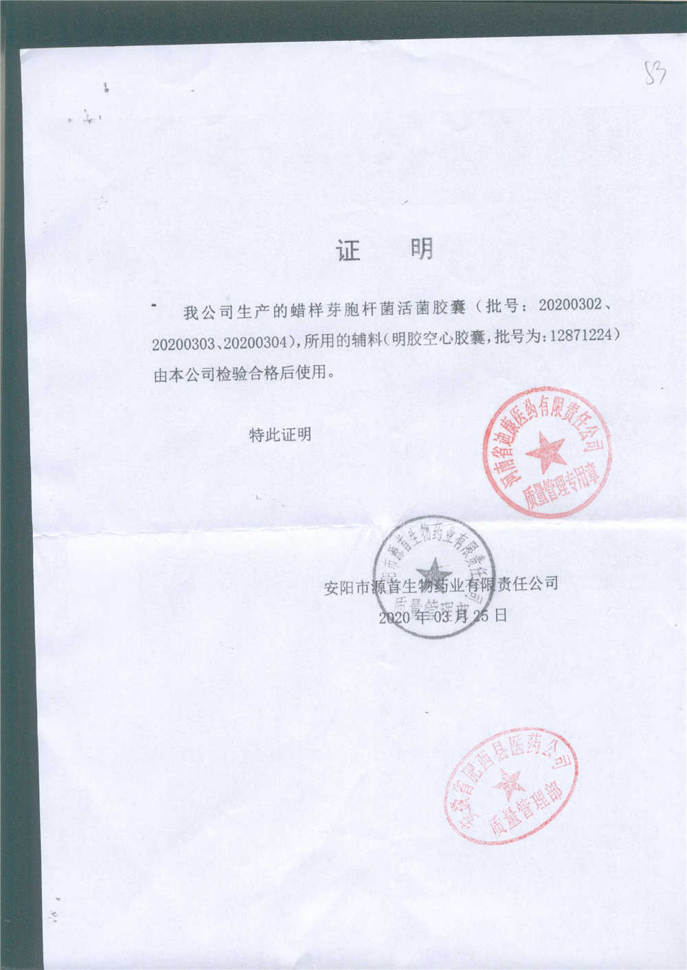 蠟樣芽孢桿菌活菌膠囊(源首) | 0.25g | 20200303(2/3) | 查看詳情 |