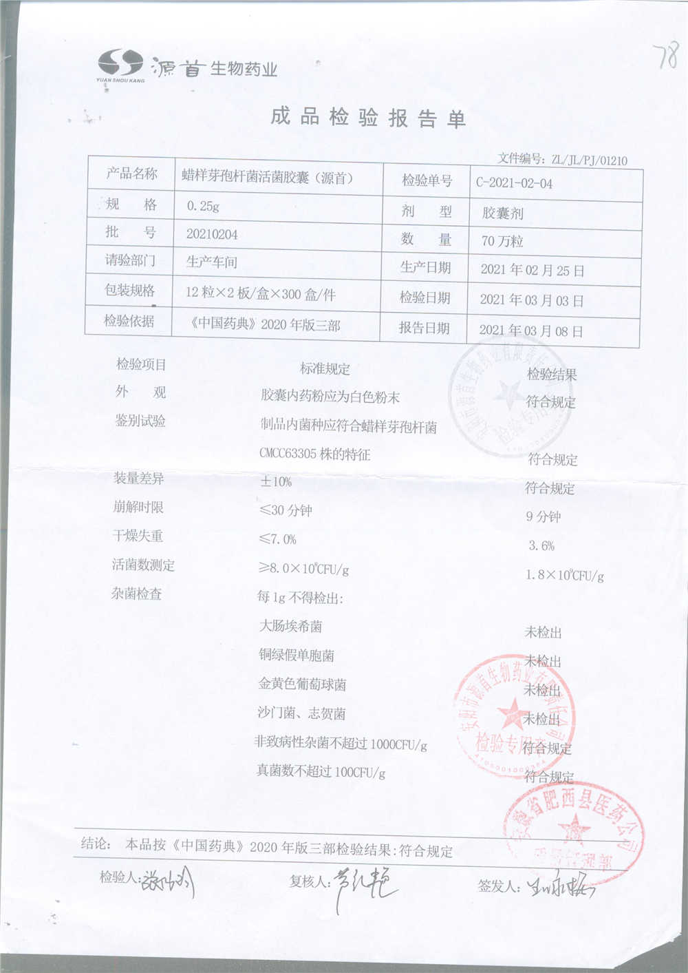 蠟樣芽孢桿菌活菌膠囊(源首) | 0.25g | 20210204(3/3) | 查看詳情 |