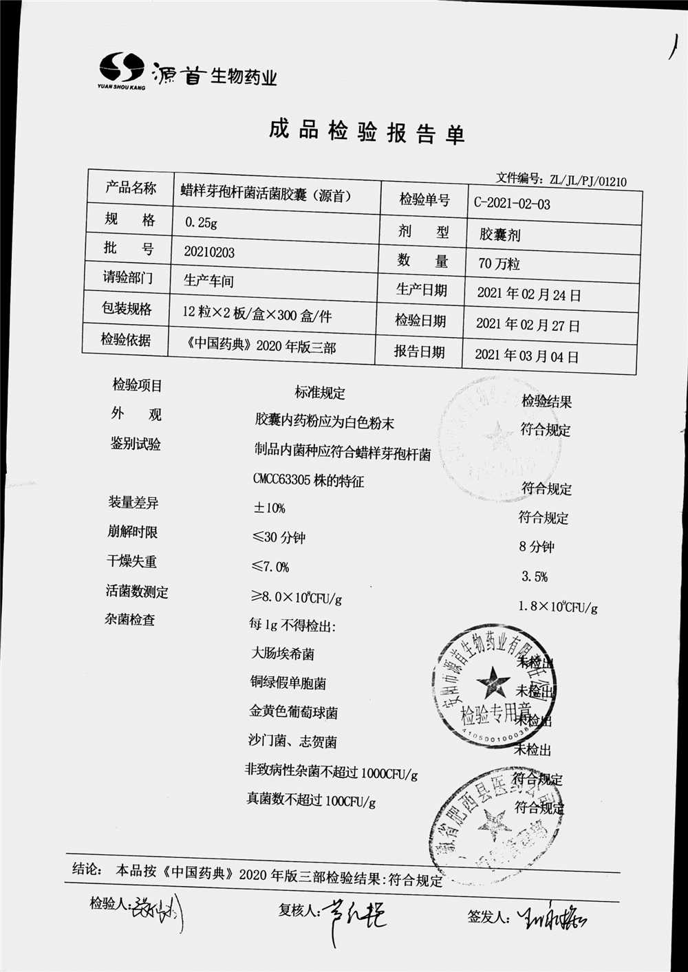 蠟樣芽孢桿菌活菌膠囊(源首) | 0.25g | 20210203(1/3) | 查看詳情 |