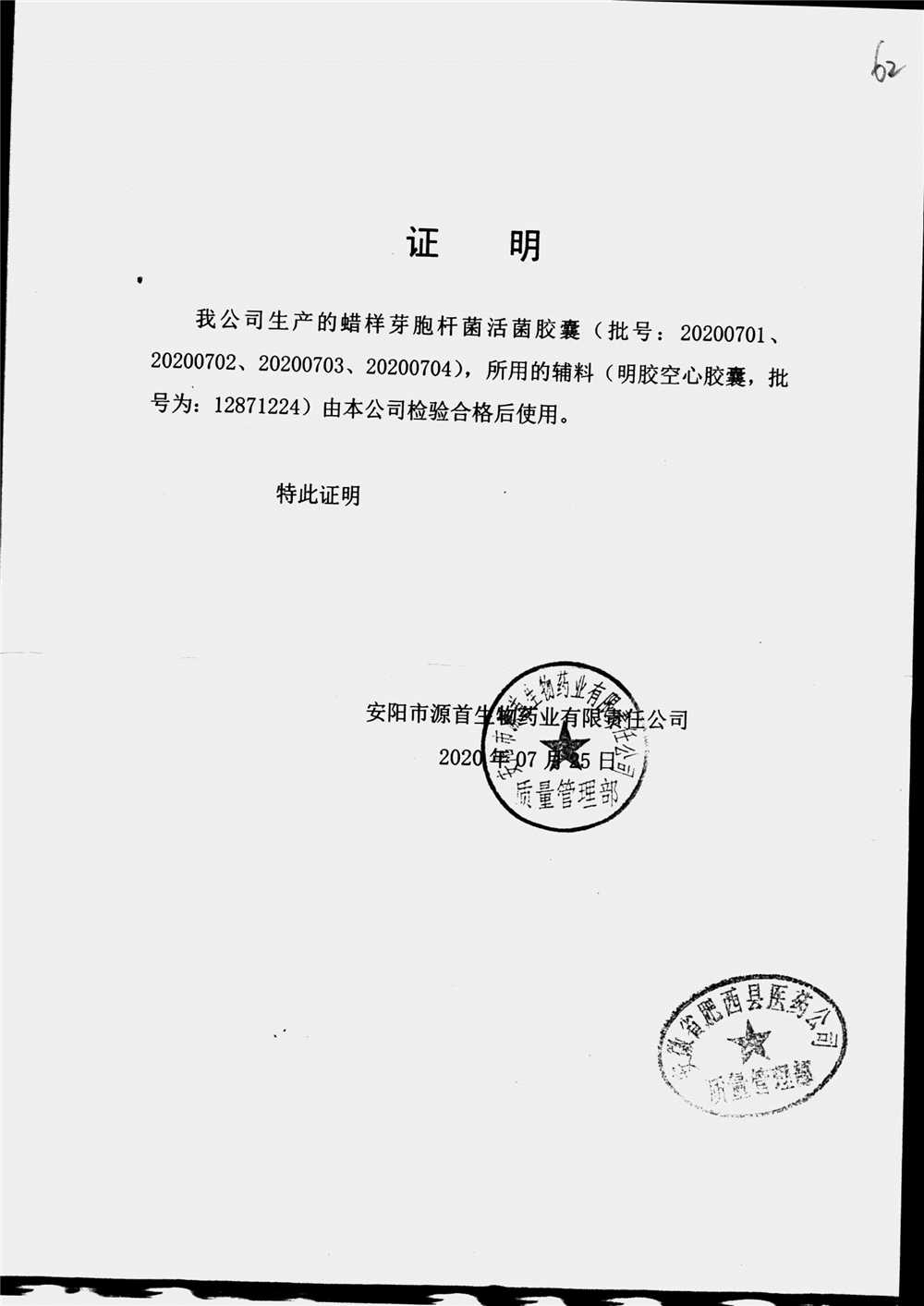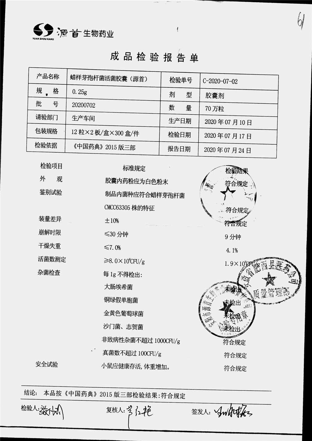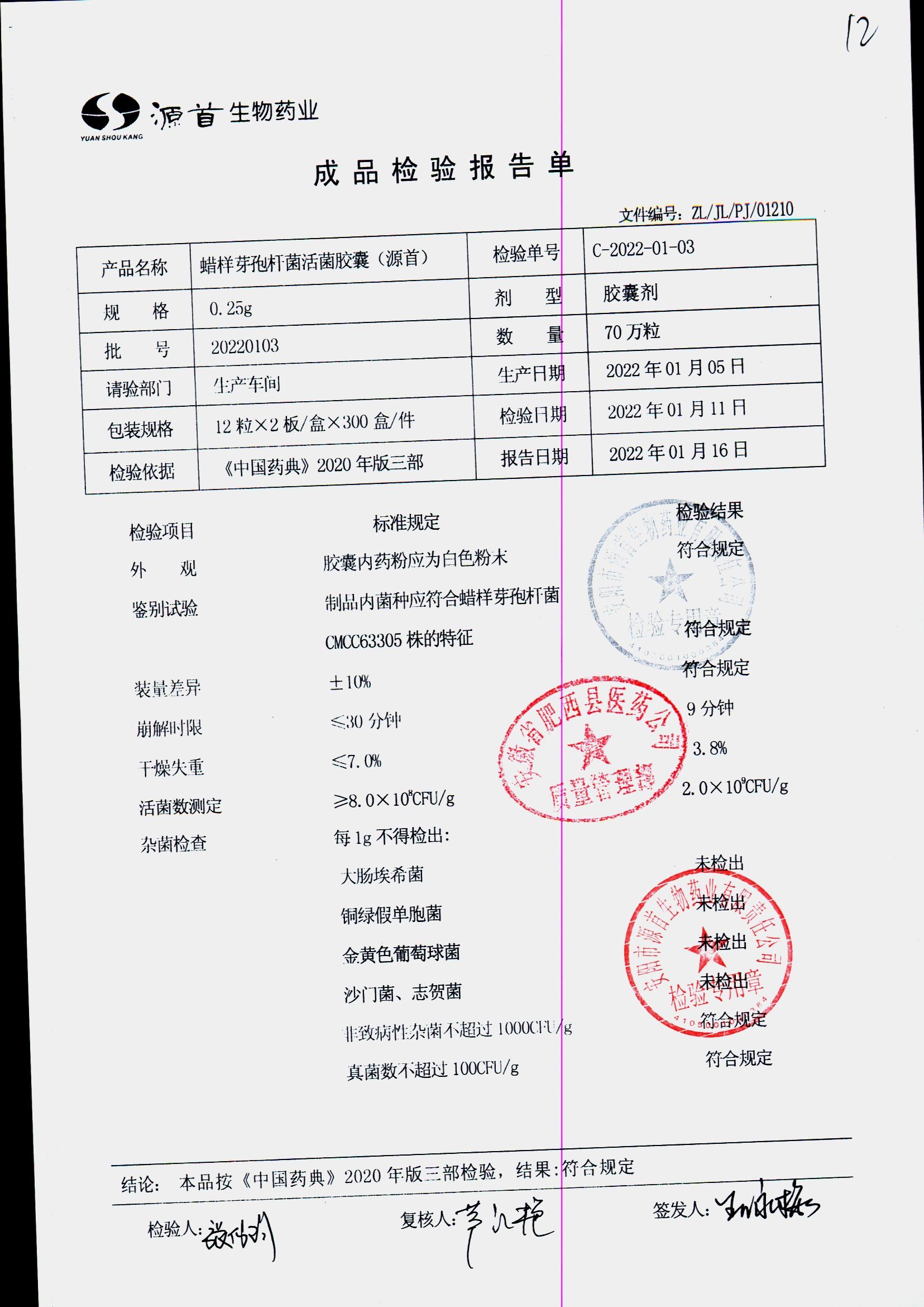 蠟樣芽孢桿菌活菌膠囊(源首) | 0.25g | 20200702(2/3) | 查看詳情 |