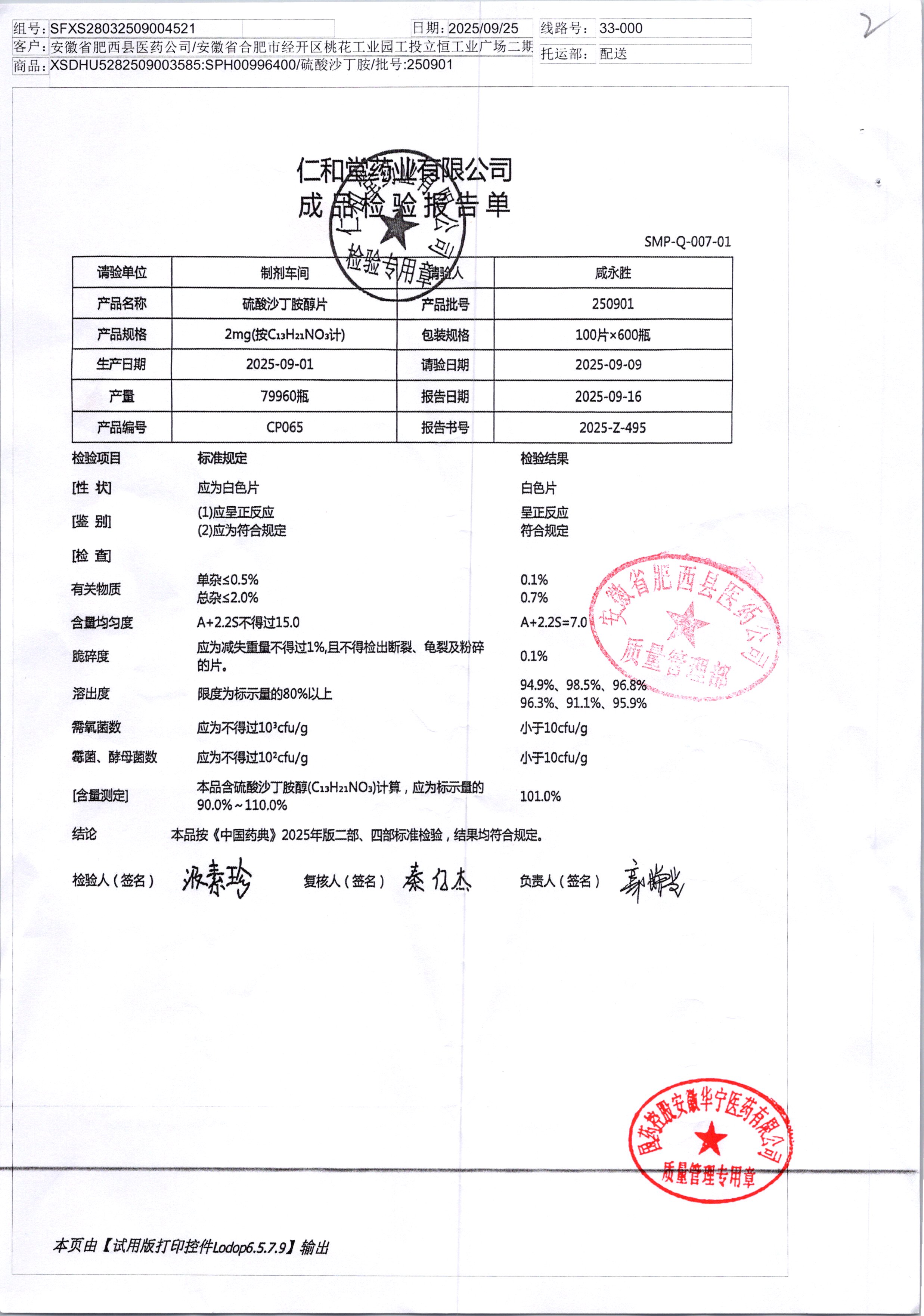 硫酸沙丁胺醇片 | 2mg*100片 | 250901 | 查看詳情 |