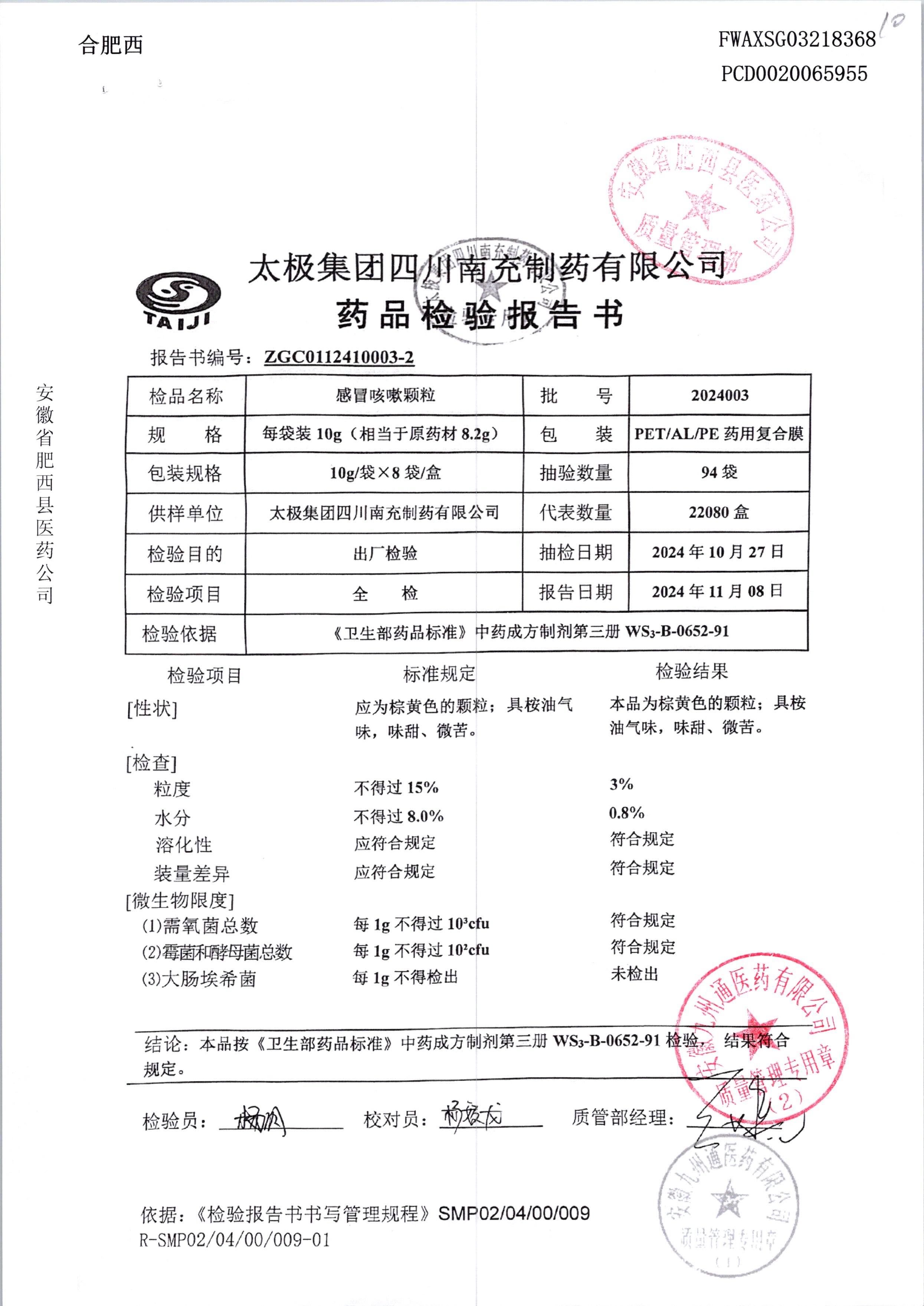 感冒咳嗽顆粒 | 10g*8袋 | 2024003 | 查看詳情 |