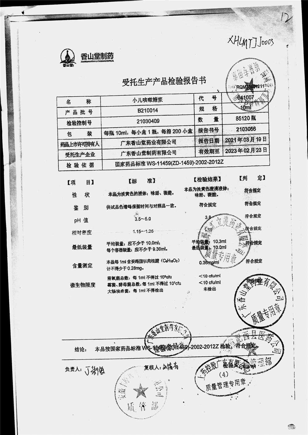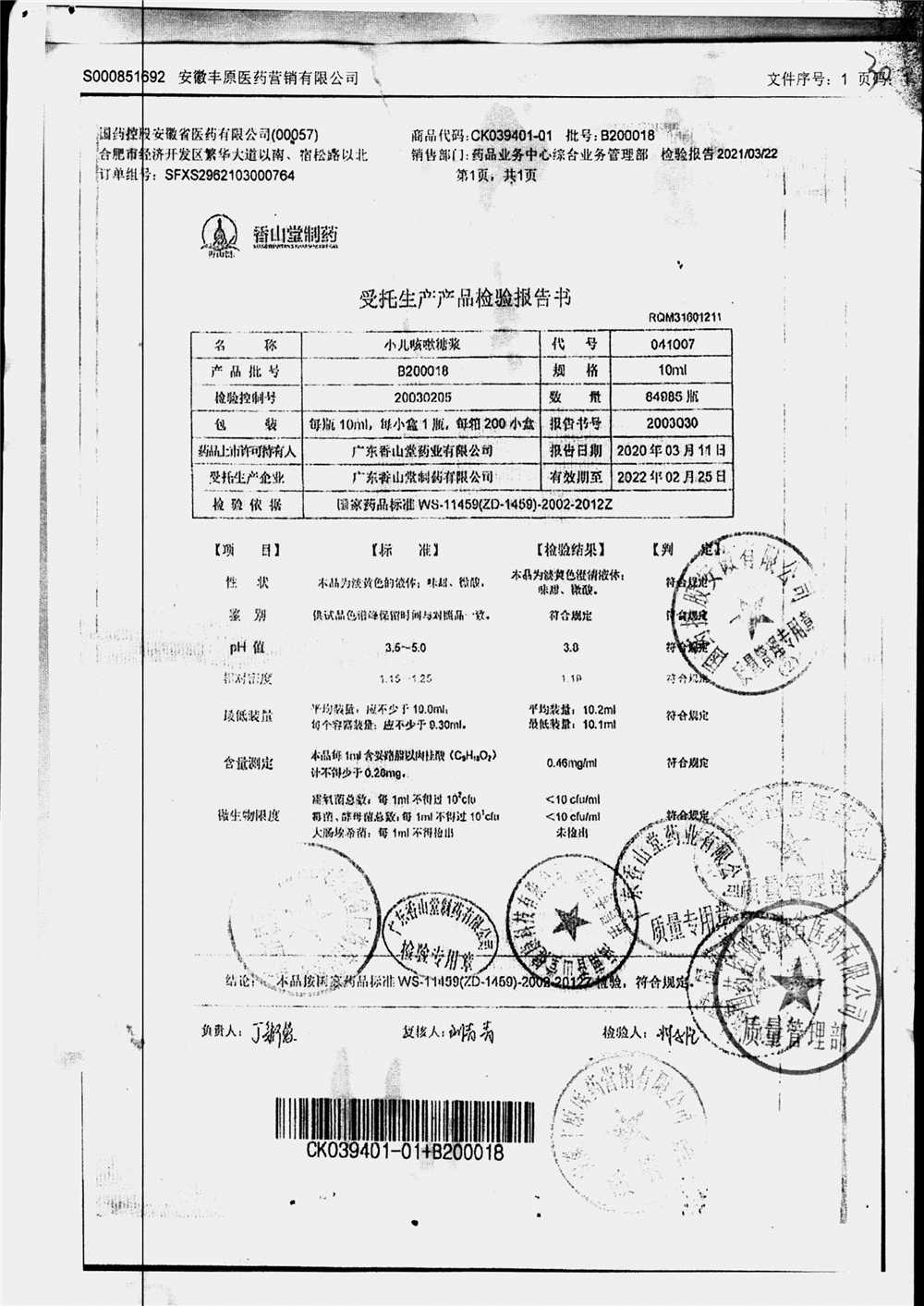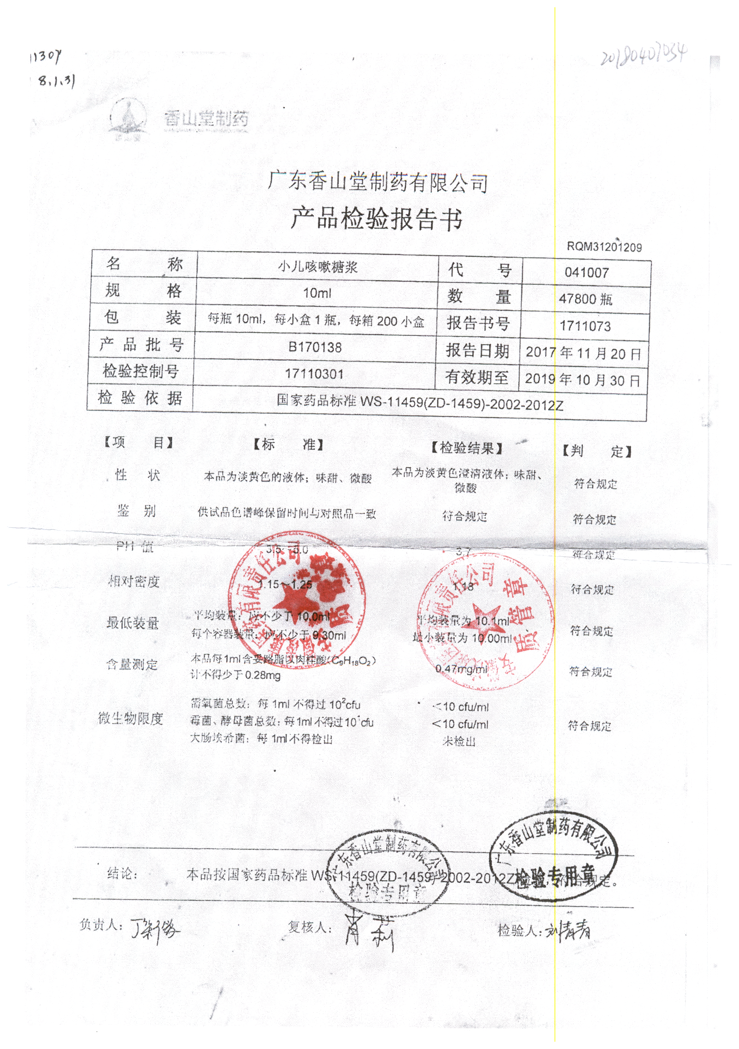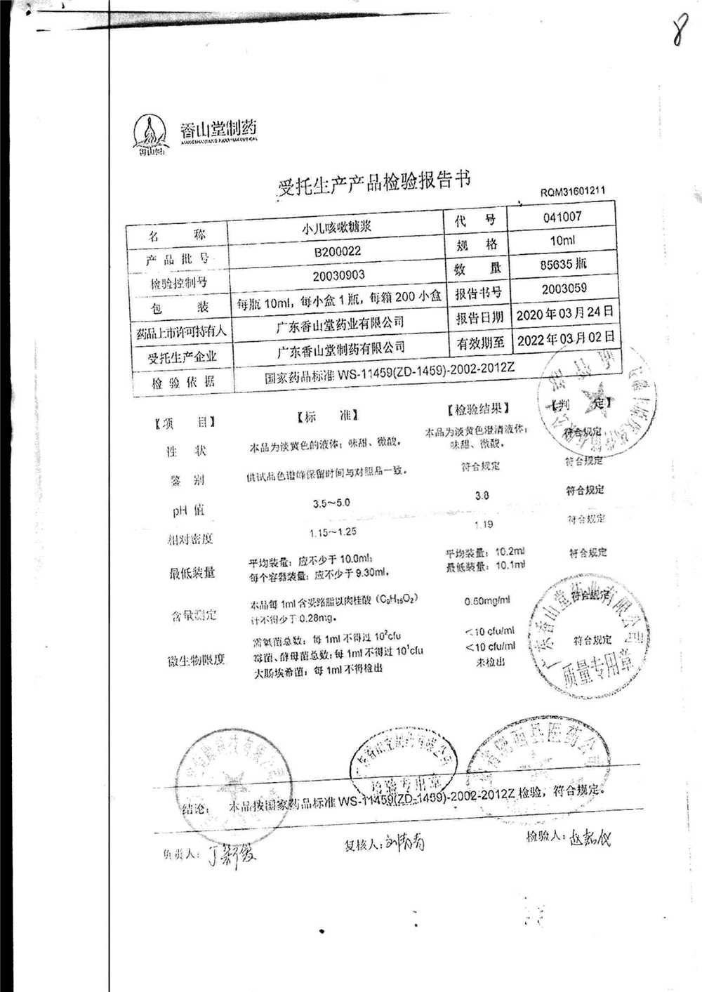 小兒咳嗽糖漿 | 10ml | B190117 | 查看詳情 |