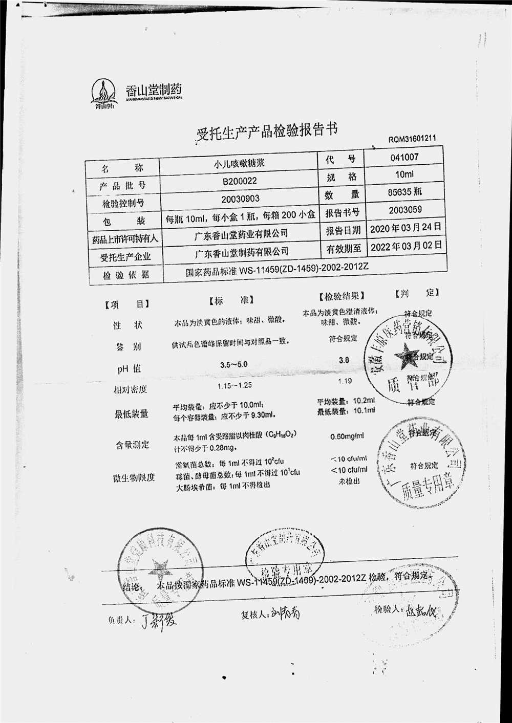 小兒咳嗽糖漿 | 10ml | B190119 | 查看詳情 |